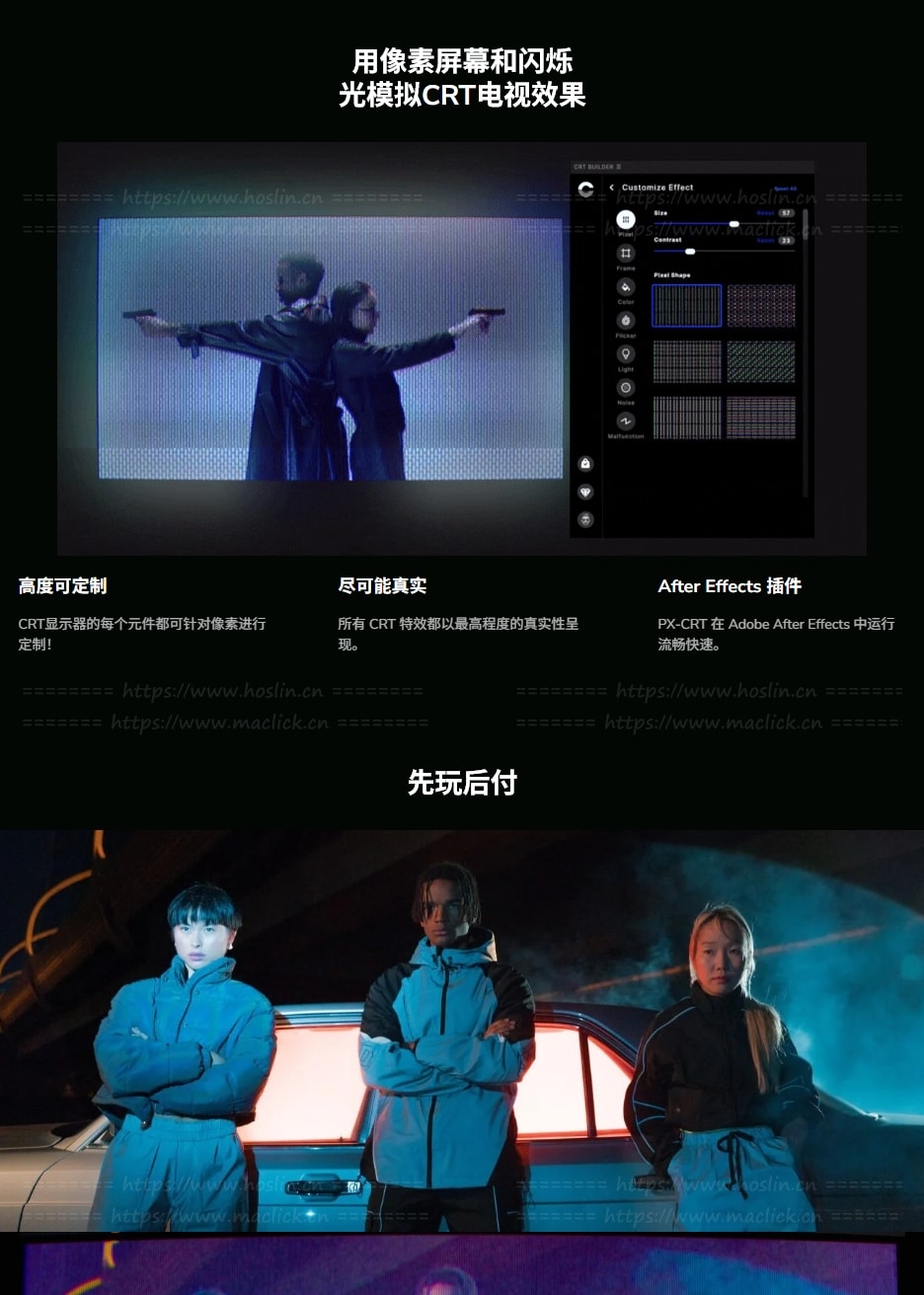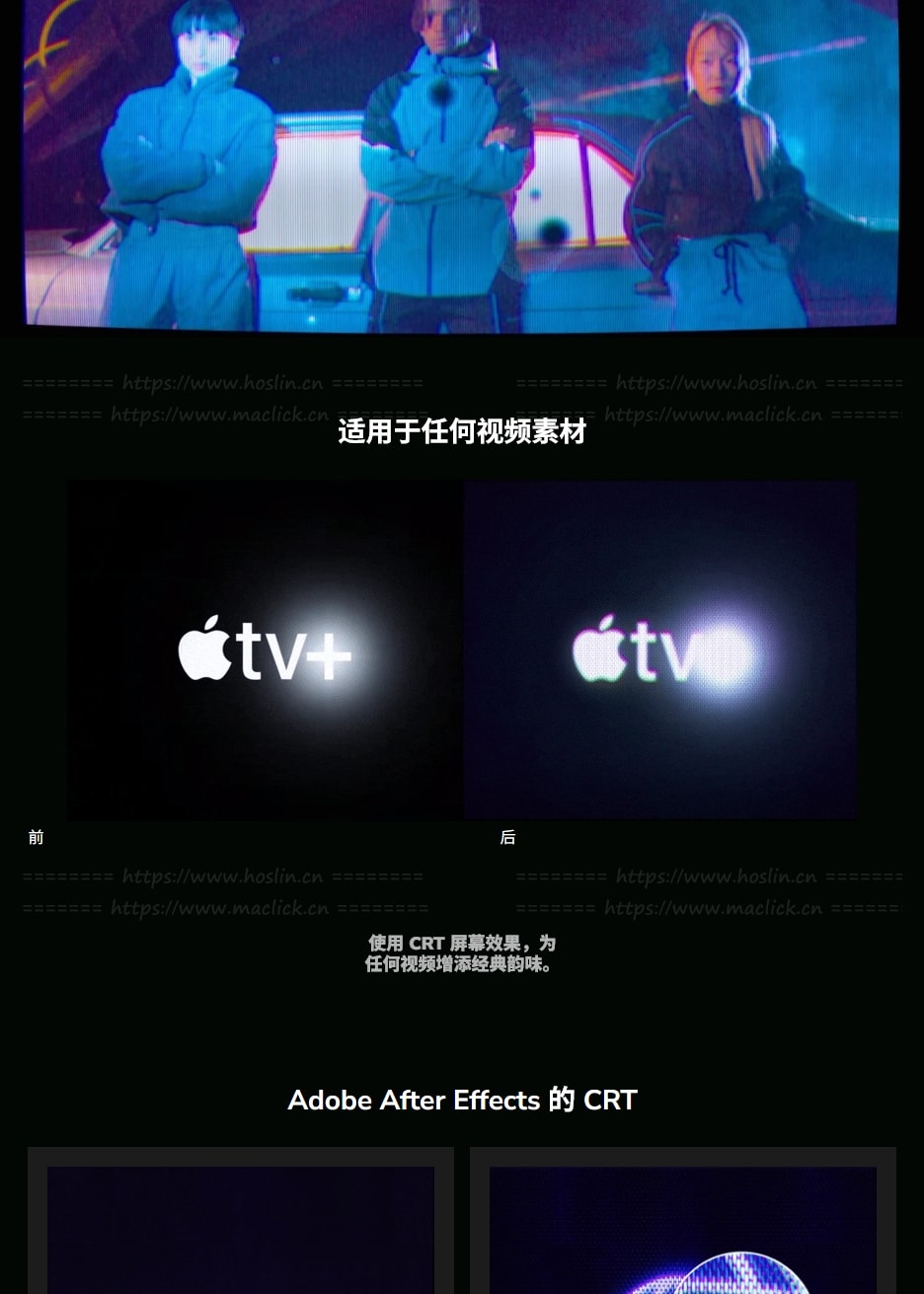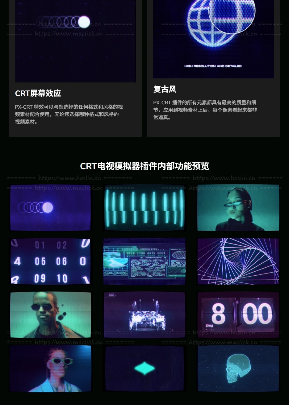 CRT TV Emulator 可以帮助您重现老式CRT电视和显示器的复古外观和风格。创建特效非常简单,只需拖放即可,而且它还允许您自定义视频素材的每一个细节,从像素的形状和排列到电视画面的故障和闪烁,无所不包。它除了常见的像素化、扫描线、亮度闪烁、信号噪点等基础 CRT 风格外,还能自定义像素形状、屏幕曲线、光线闪烁、干扰与瑕疵等细节,让画面更像真实的老式电视机或监视器输出。适合用于音乐视频、复古风片段、电子产品展现等场景。拖放式操作简单直观,同时可细调各项参数满足不同复古程度的设计需求。