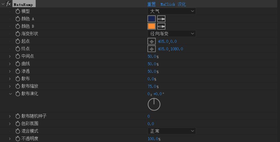 NatuRamp 提供三种独特模式:大气、有机和矿物,并配有颜色渗透、空间噪波散布、控制曲线和色调调节等参数,让渐变看起来更随机、柔和而有层次。操作界面简洁直观,可直接在合成中调整,无需复杂蒙版或堆叠效果,大幅提升工作流程效率。