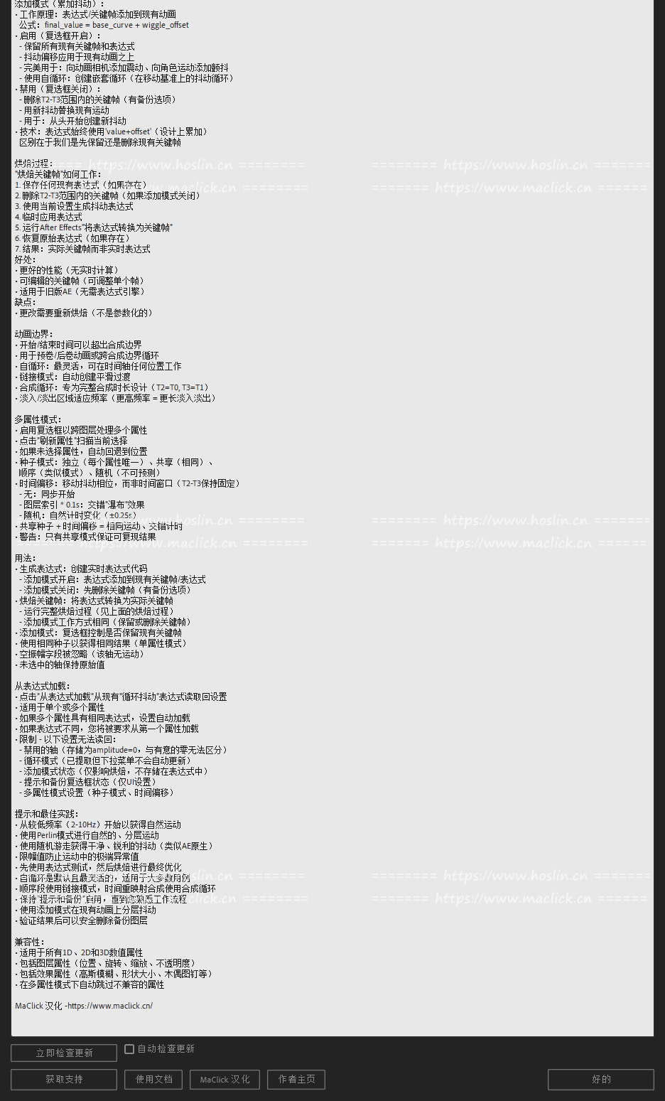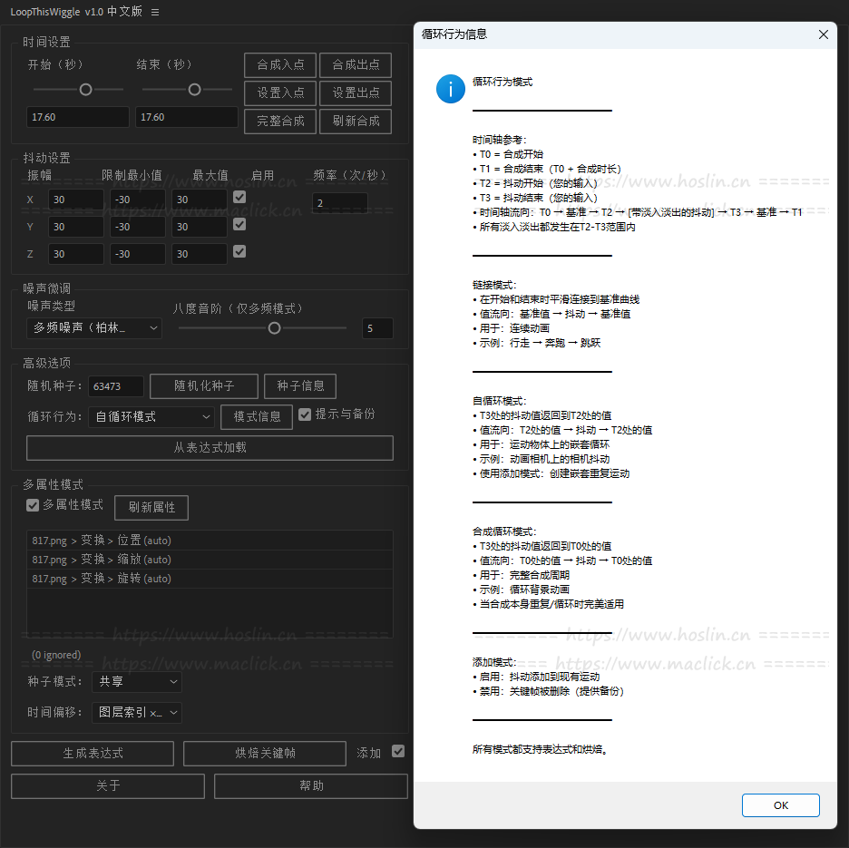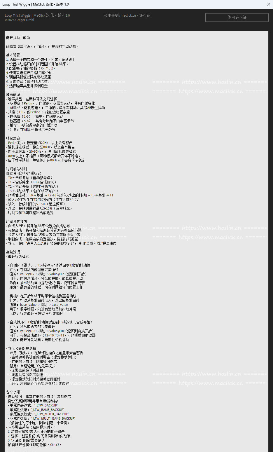 与 AE 自带的抖动动画不同,Loop This! Wiggle 使用种子随机算法生成可复现、可控的随机运动,因此你可以设定循环区间、调整抖动强度、频率和动画属性,并确保动画在循环结束时与起点一致,不会出现突兀跳跃。它支持生成表达式版本(实时、可编辑)或将运动烘焙成关键帧便于导出或交付,适用于位置、旋转、缩放等多种属性。特别适合制作无缝背景动效、循环标题动画、UI 细节动态、Lottie 或 GIF 动画等需要重复播放的场景,是提升循环动画效率与专业度的实用工具。