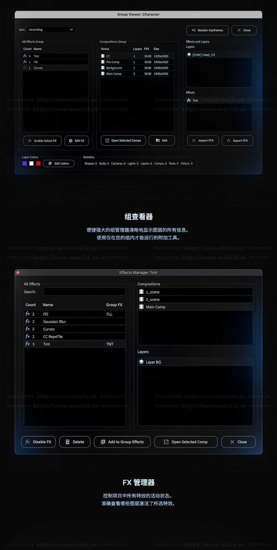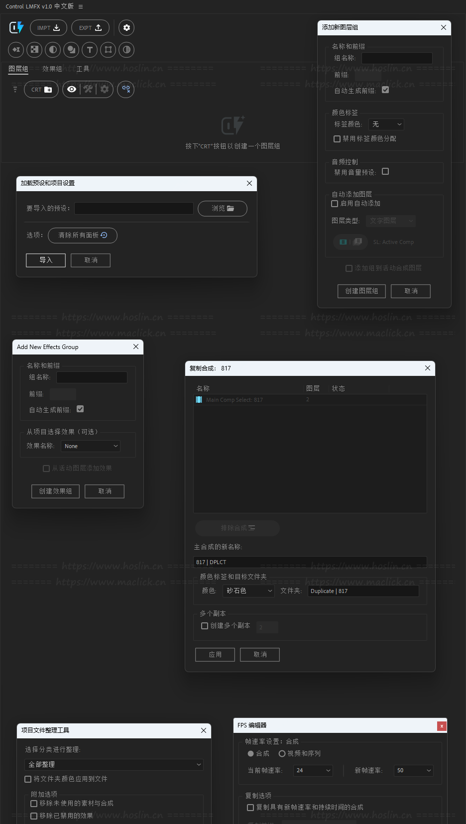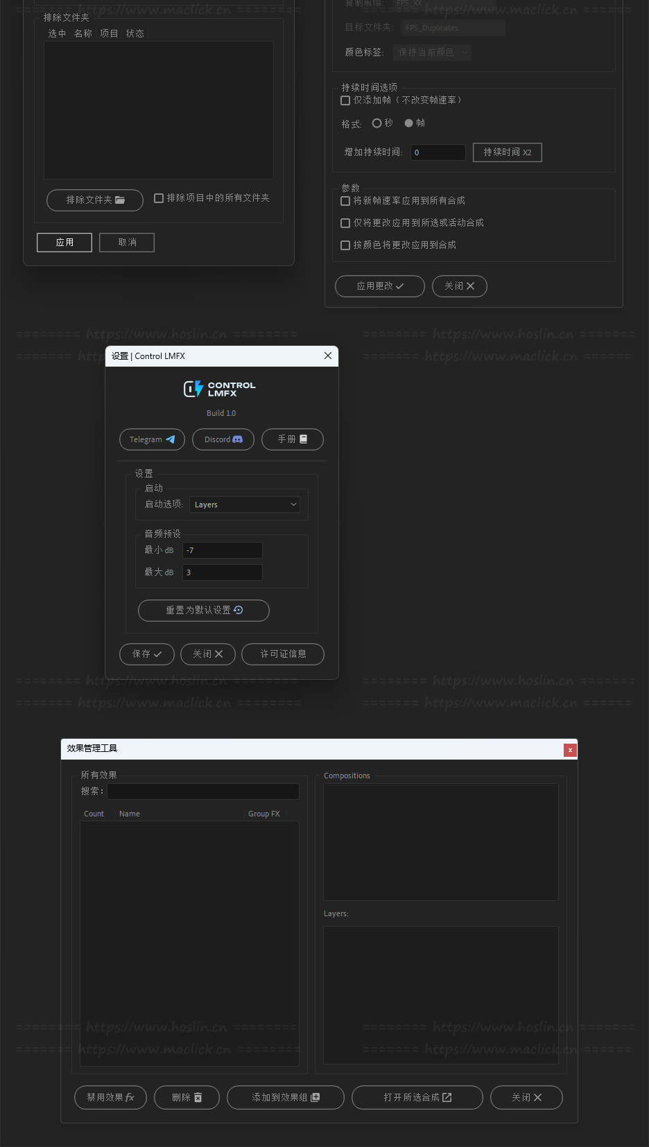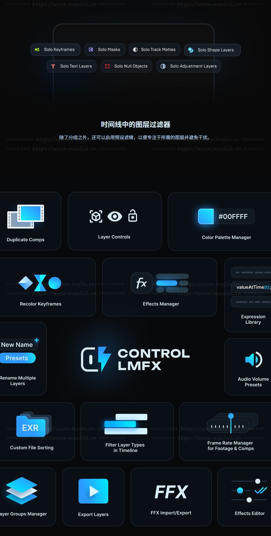 Control LMFX 还包含一系列额外的工具如图层过滤器、批量操作工具、关键帧与表达式管理等实用扩展,以实现更灵活的工作流程。扩展您的操作范围、加快流程并减少重复性任务。适合处理复杂工程、模板开发或提高动态图形制作效率。