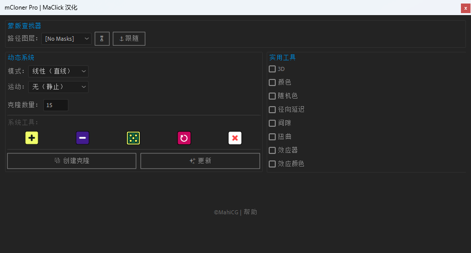 mCloner Pro 同时还支持多图层随机分配、路径动画、颜色变化以及3D模型整合等功能,非常适合制作阵列动画、动态图形设计、动感文字和视觉背景效果,是提升 AE 动效效率的实用工具。