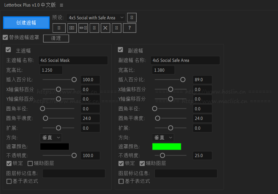 Letterbox Plus 是用于 After Effects 的画幅边框生成工具,可快速创建电影级遮幅黑边和画面遮罩。通过直观的操作界面,用户可以一键生成横向或纵向黑边、双重信箱组合以及带圆角的画面边框,无需手动计算比例或绘制遮罩,大幅简化画幅设计流程。Letterbox Plus 内置多种预设(默认提供 12 种信箱样式),并支持自定义和共享预设,方便在不同项目或合成中快速调用。用户还可以将生成的边框设置为参考图层,用于构图辅助或画面比例控制。