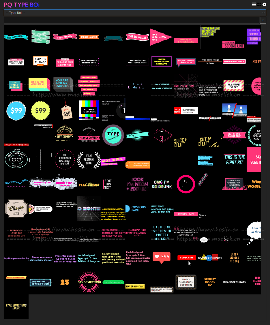PQ Type Boi 是一款 After Effects 的动画排版工具,内置120+ 预制文字动画布局,帮助用户快速创建风格多样的动态字体效果。用户可以在 AE 的扩展面板中浏览带动画预览的缩略图,只需点击或双击即可自动生成对应的文字动画合成,大幅减少从零制作文字动效的时间。