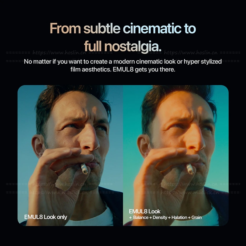 EMUL8 内置多种经典胶片风格,并提供完整的电影质感工具,包括胶片光晕、电影泛光、16mm/35mm/65mm 胶片颗粒、色彩密度控制、暗角以及电影分辨率等参数,可模拟模拟胶片的柔和层次和色彩密度。所有效果都可以独立启用或关闭,并进行细致调整。插件还支持多种相机Log 色彩曲线(如 Sony S-Log、Canon C-Log、RED Log、DJI D-Log 等)以及 Rec.709 工作流程,适用于不同设备拍摄素材的电影化调色。整体设计强调简洁高效,让创作者在几分钟内完成具有胶片氛围的调色效果。