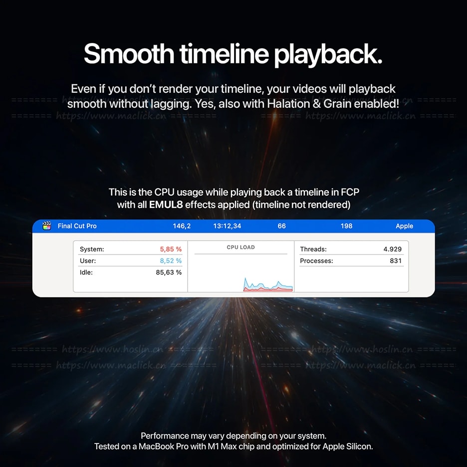 EMUL8 – Film Emulation 是一款为 Final Cut Pro 开发的电影胶片模拟插件,旨在以更高性能和更简洁的流程,为视频素材快速赋予真实的胶片质感,可作为为 Dehancer 的轻量替代方案。EMUL8 注重实时播放与流畅操作,在启用颗粒、光晕等效果时依然可以保持顺畅时间线,大幅提升调色效率。