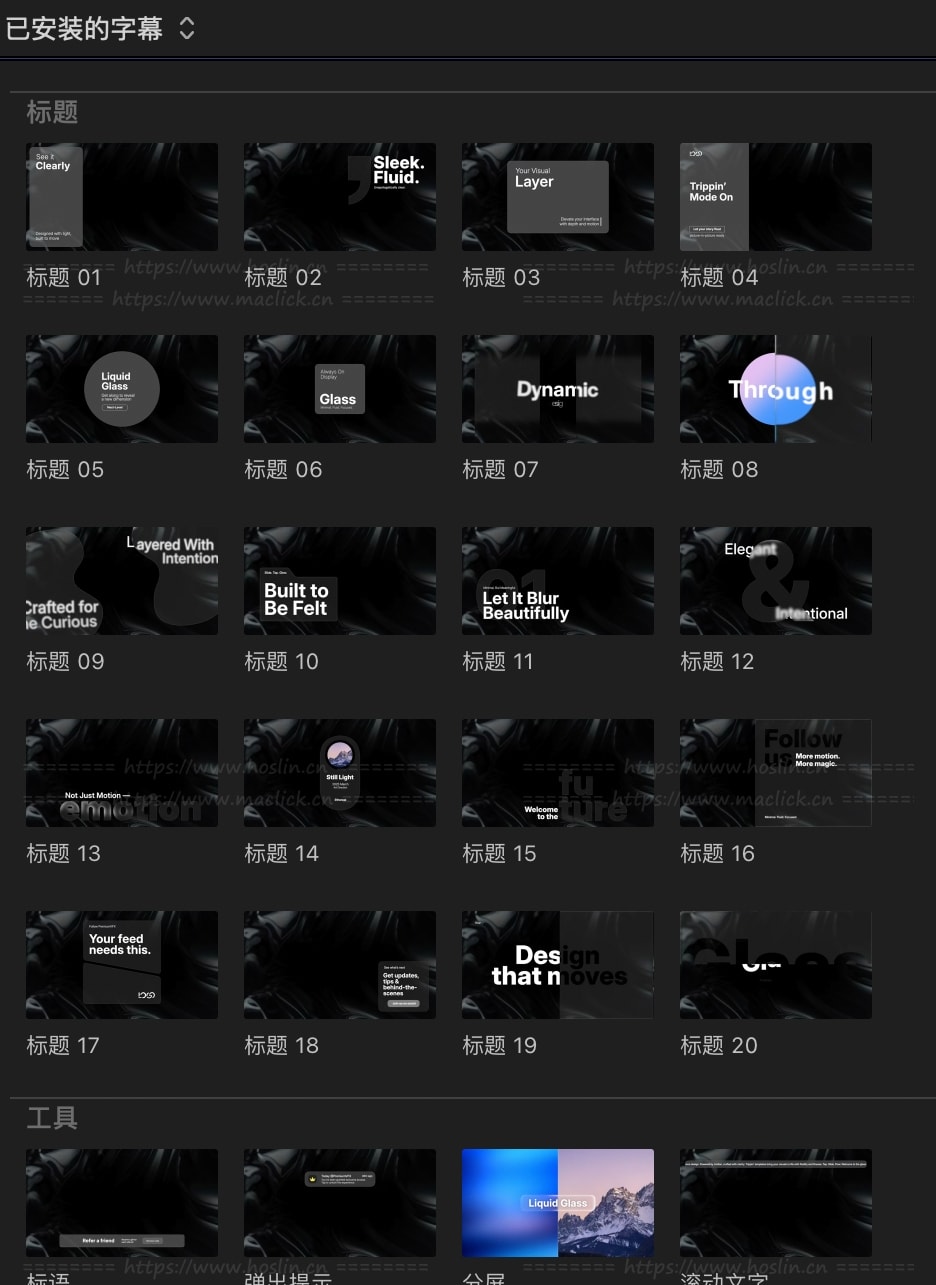 40 个元素,呈现流畅、半透明的“液态玻璃”效果,尽显优雅。Liquid Glass 是一套标题和转场特效包,旨在为您的剪辑带来清晰、优雅和动感的视觉效果。其灵感源自苹果简洁流畅的用户界面UI风格:柔和的透明度、层次分明的动态效果和精准的动画,这套特效包完美契合那些希望打造高级质感却又不想让时间线过于复杂的用户。