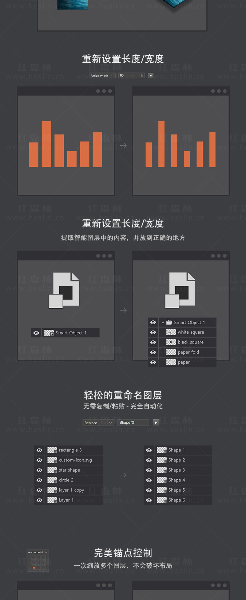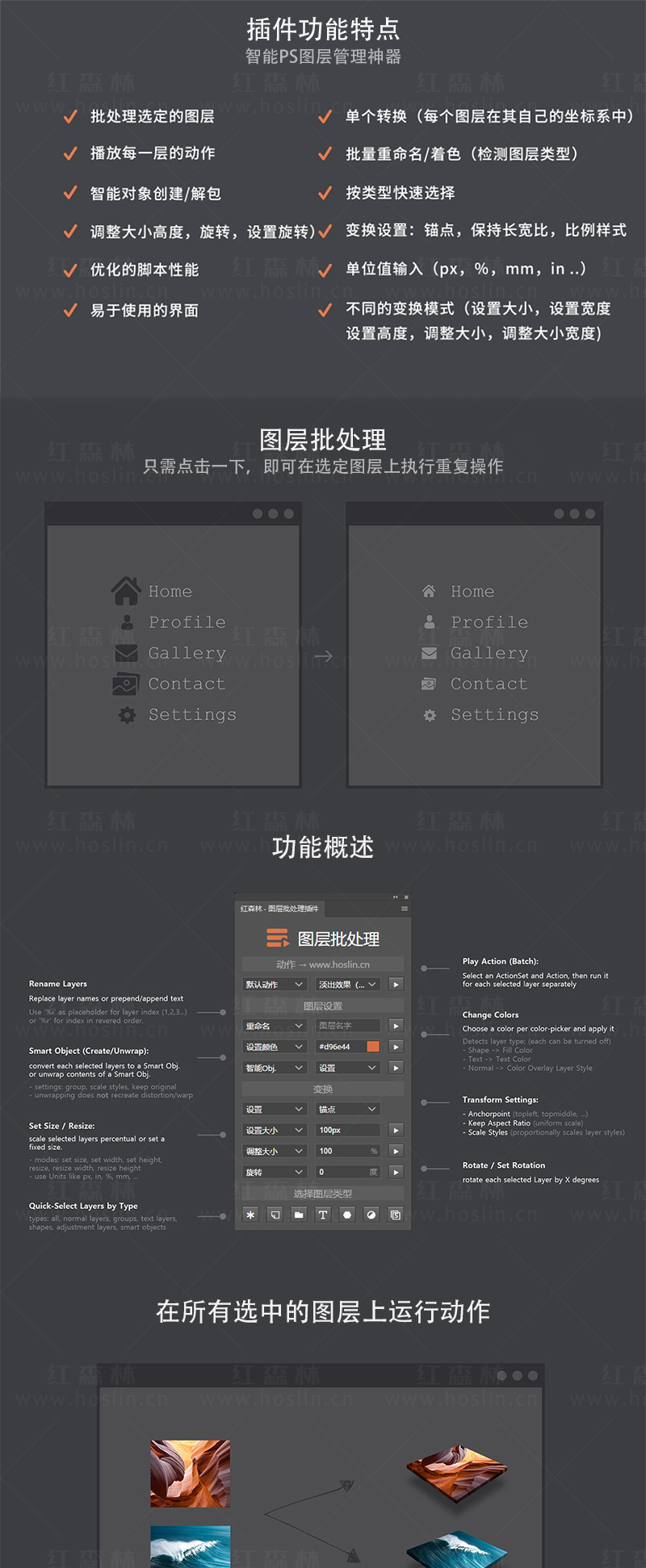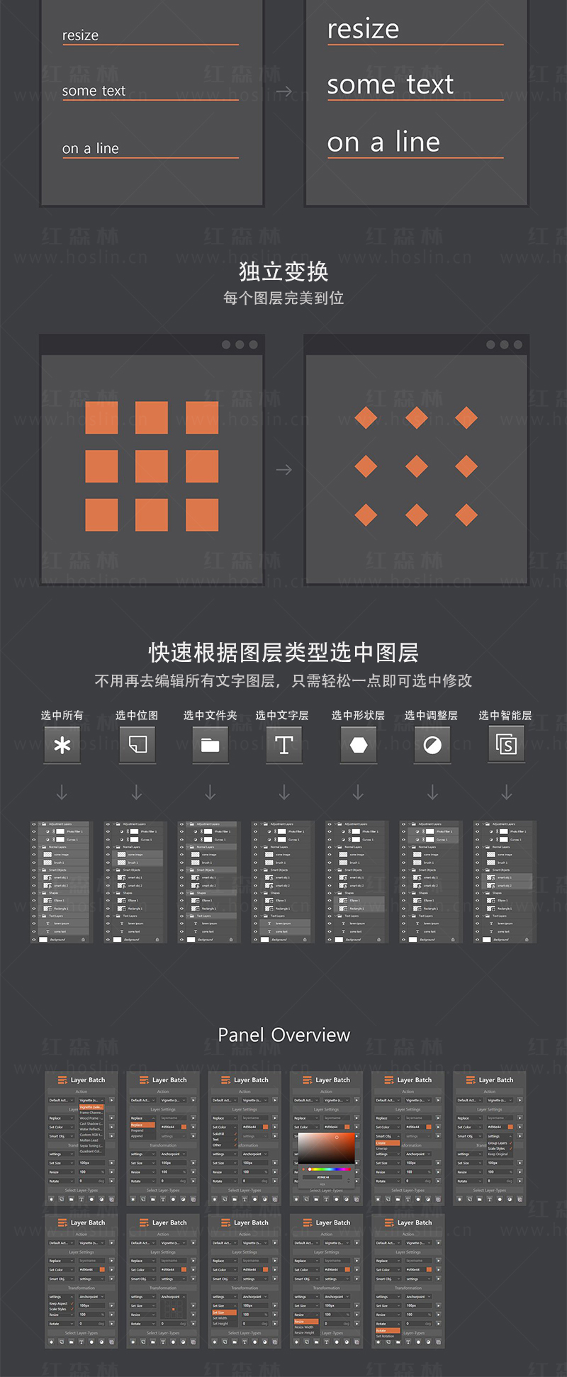 Layer Batch图层批处理批量通过一次编辑所有选定的图层,可以在Photoshop中节省大量的时间,还可以一次调整多个图层的大小,旋转,着色或重命名。除了这些您还可以创建或解包多个智能对象。如果还有其他用例,则可以简单地创建自己的操作,并使用面板为所有选定的图层运行该操作。