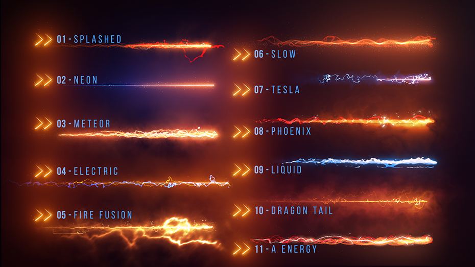- 包括33种预设中的11种能量样式:11种Energy Full HD预设,11种Energy 4K预设,11种Energy Text&Logo预设。