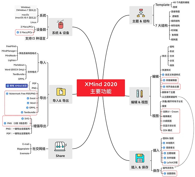 在众多的思维导图制作工具中,我们为什么向您推荐 XMind 呢?下面我们用一张脑图来罗列一下 XMind 的主要功能: