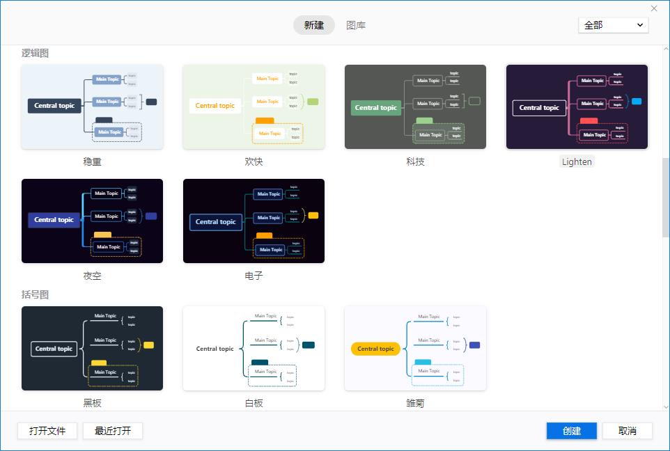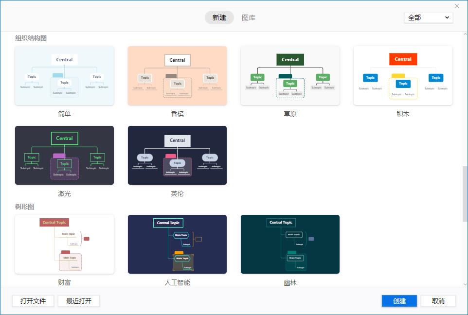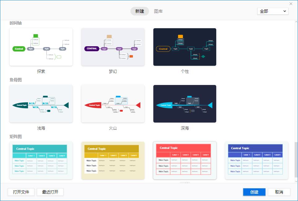 可以看到 XMind 的功能非常全面,而且它还可以制作鱼骨图、二维图、树状图、逻辑图、矩阵图、时间轴、括号图、组织结构图等多种结构主题等。