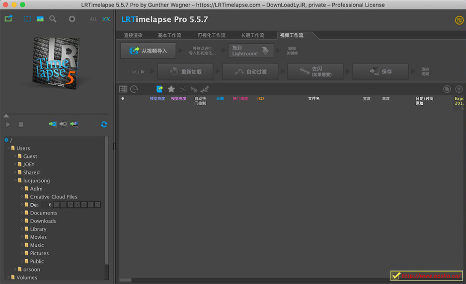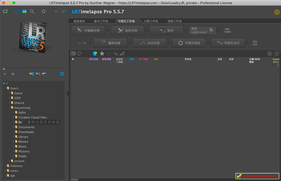 LRTimelapse v5.5.7 Build 691中文Mac版是一款专业的延迟摄影编辑渲染工具,具有高清输出、简单易用、无缝转换等特点,程序可以配合 Adobe Lightroom, Adobe Camera RAW 和 Adobe After Effects 等程序完美配合使用用来制作延时摄影, 可以做到平衡曝光不一致( 去除闪烁等现象)关键帧参数自动过渡的功能。是非常强大的一款延迟摄影工具! LRTimelapse Pro可以将您的影片提升一个水准。此外,LRTimelapse Pro 也是为你的延时电影抗闪烁的最好的工具之一。