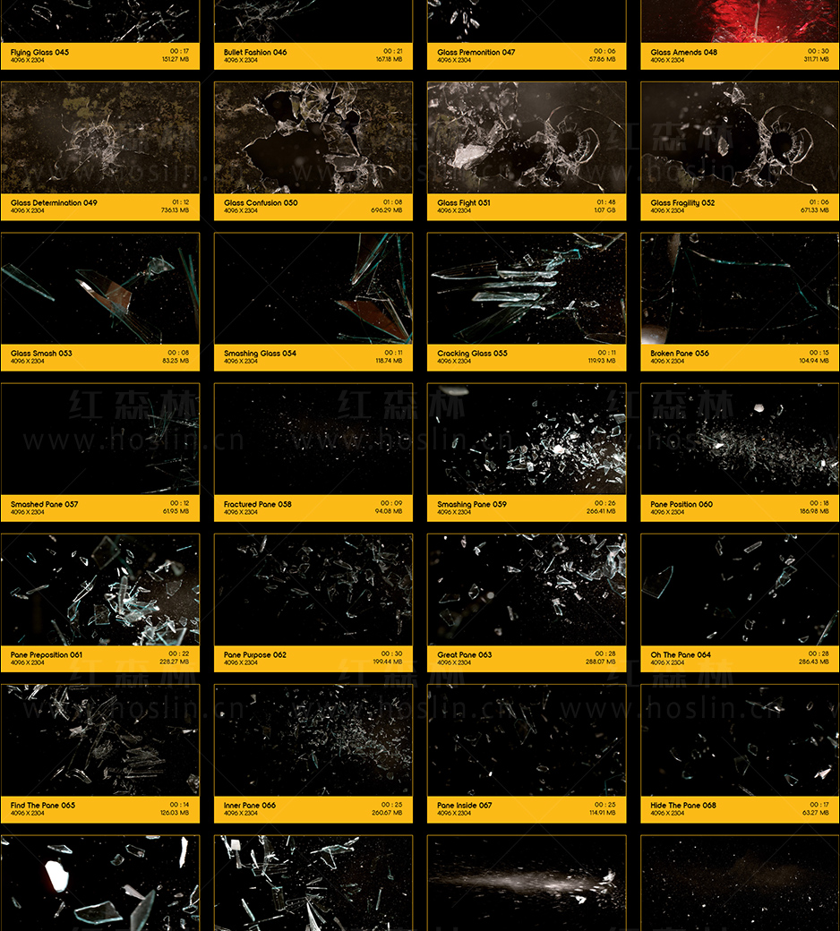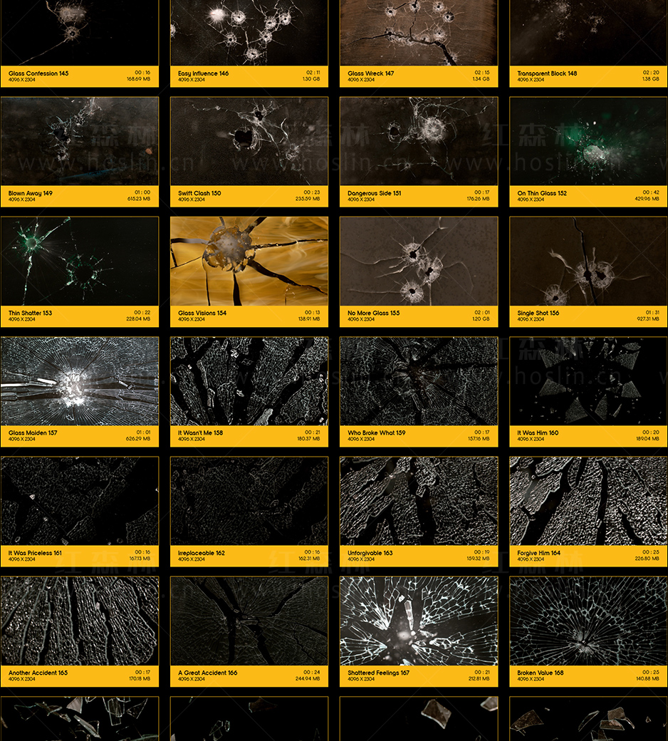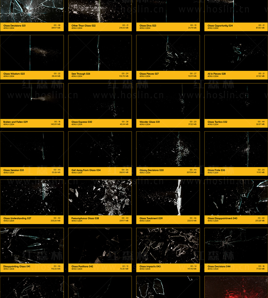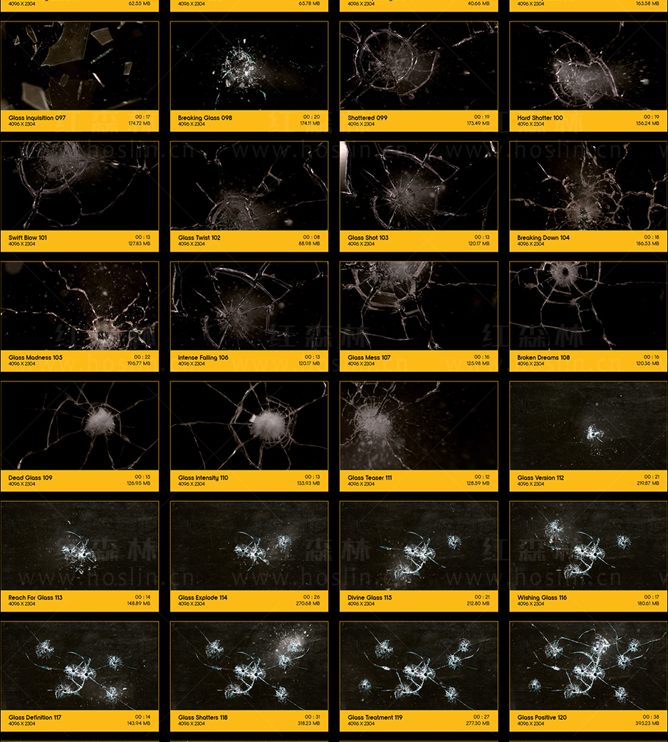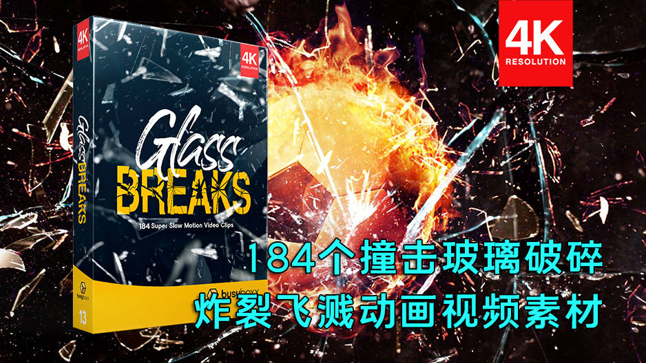 提供184个撞击玻璃炸裂破碎飞溅合成动画4K视频素材。在Phantom Flex上以高达1000 FPS的速度拍摄,只需拖到您的视频上,无需任何插件,完美用作特殊效果或背景。分辨率:4096*2304,4K高清;无透明通道(可修改混合模式去黑底透明叠加使用)。