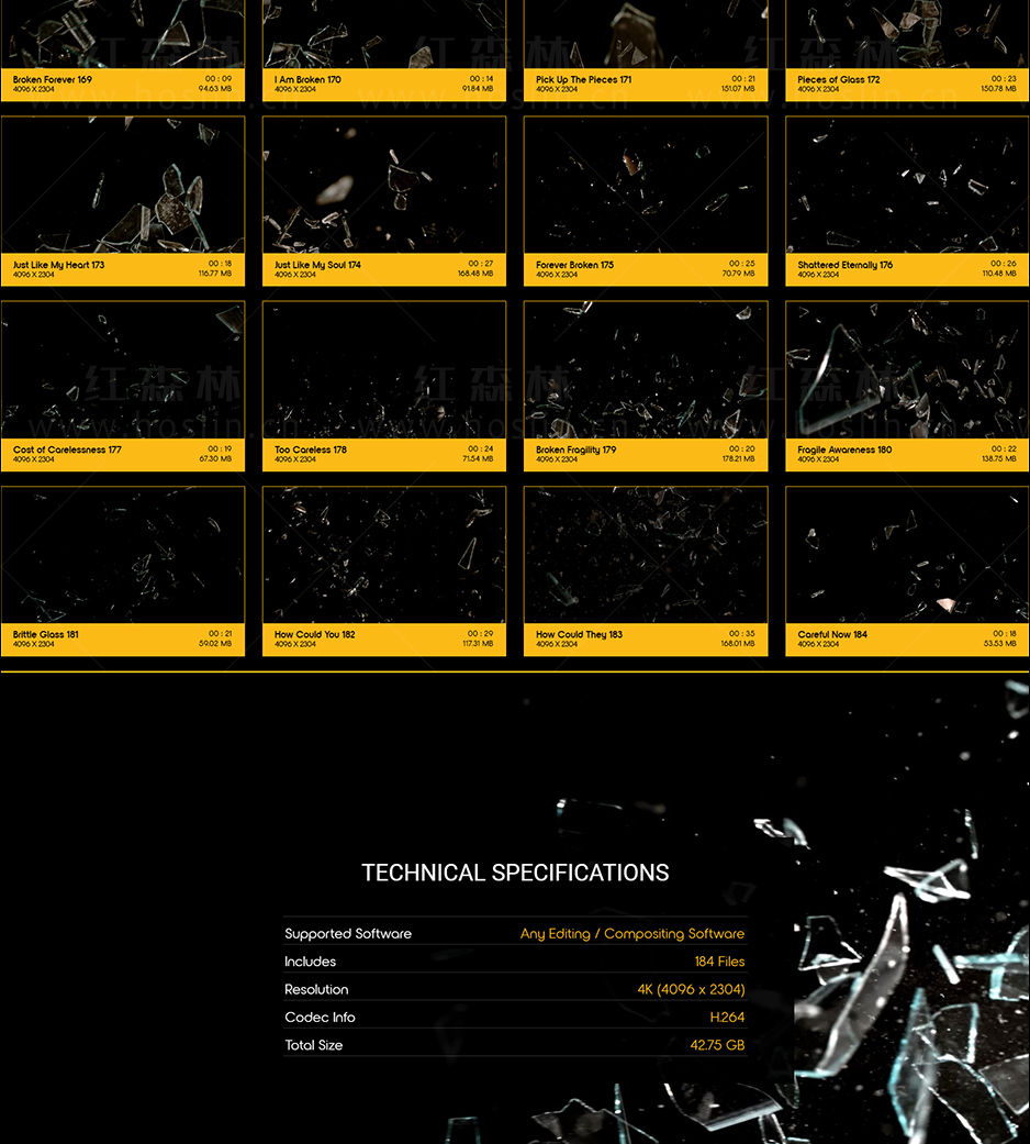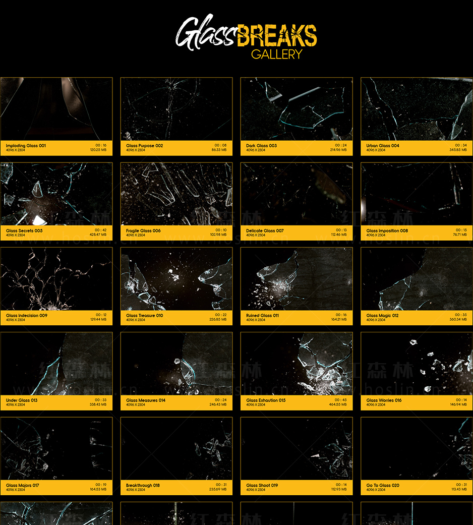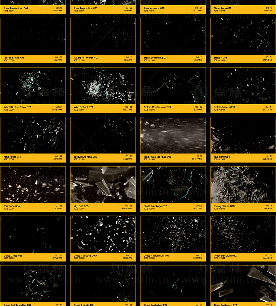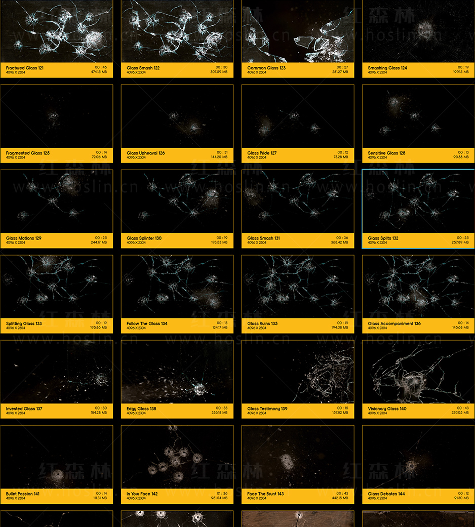 提供184个撞击玻璃炸裂破碎飞溅合成动画4K视频素材。在Phantom Flex上以高达1000 FPS的速度拍摄,只需拖到您的视频上,无需任何插件,完美用作特殊效果或背景。分辨率:4096*2304,4K高清;无透明通道(可修改混合模式去黑底透明叠加使用)。
