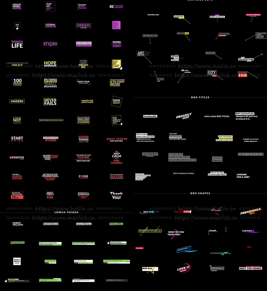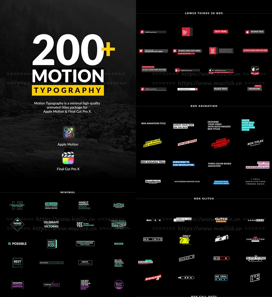 200个现代迷你简洁商务文字标题字幕条排版动画,支持中文输入,能够修改大小位置颜色等属性。Apple Motion,Final Cut Pro X 兼容项目,全高清分辨率(1920×1080)像素,可调整大小。井井有条的模板,200多个动画标题,简单易编辑。
