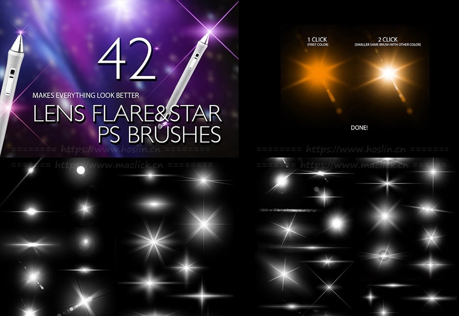 42支镜头光晕和星星Photoshop笔刷 – 单独下载:【PS笔刷】42支镜头光晕和星星Photoshop笔刷 42 Lens Flare & Stars Photoshop Brushes