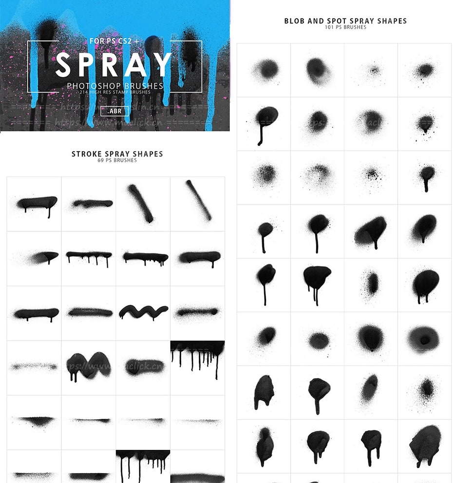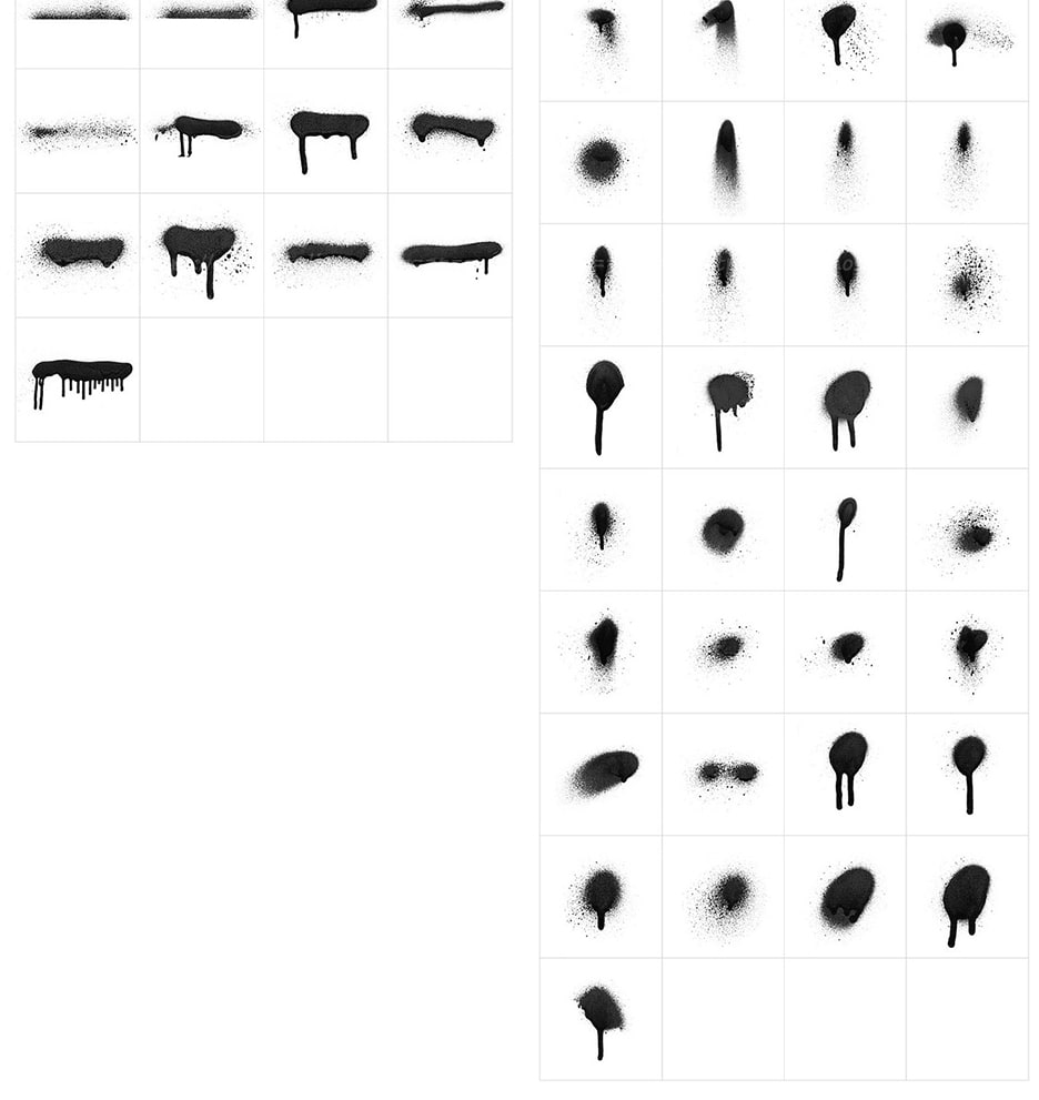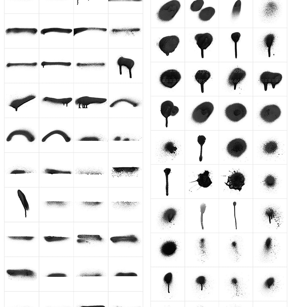 - 214个独特的喷涂效果(纹理喷雾,轻涂,斑点,渗漏,颗粒),最大5000像素大小