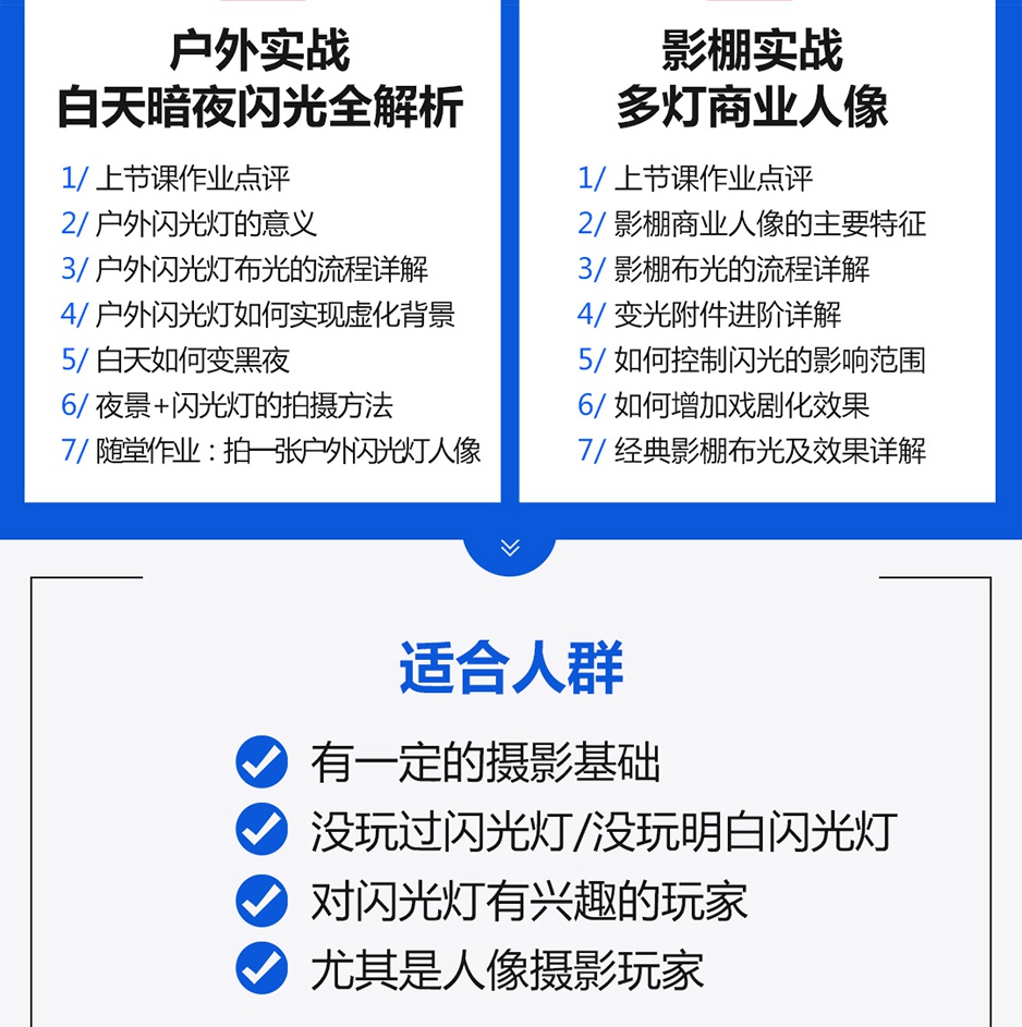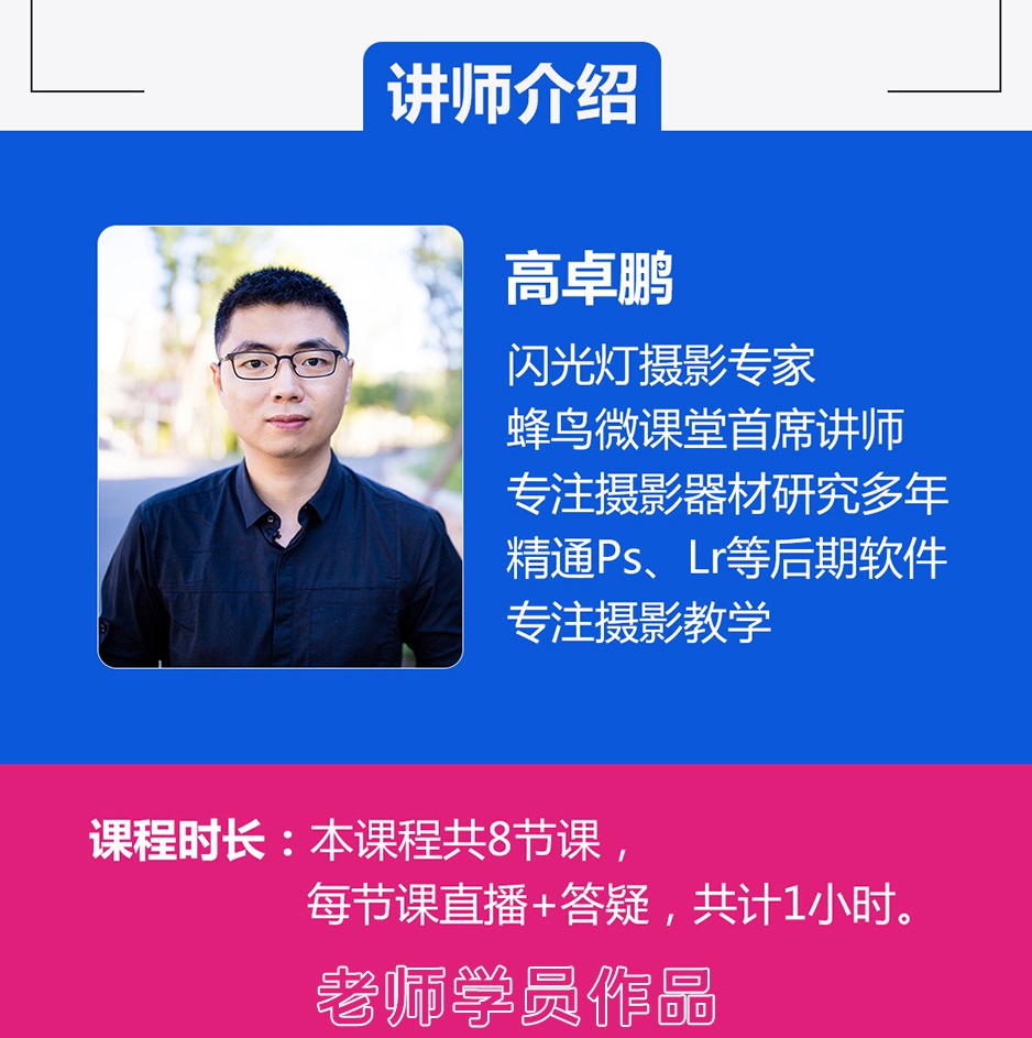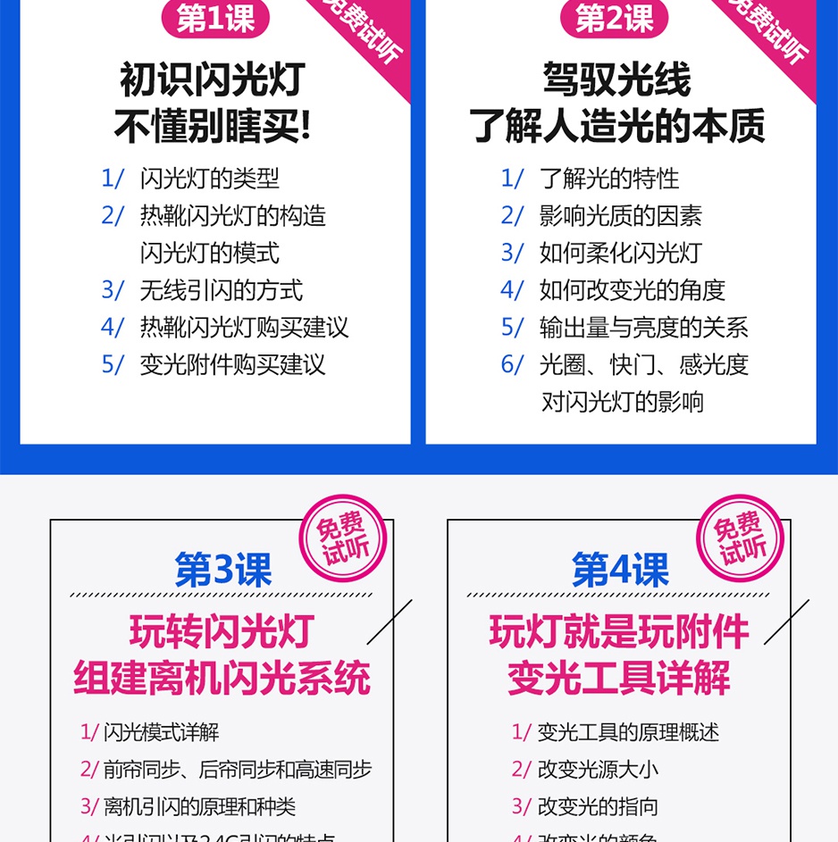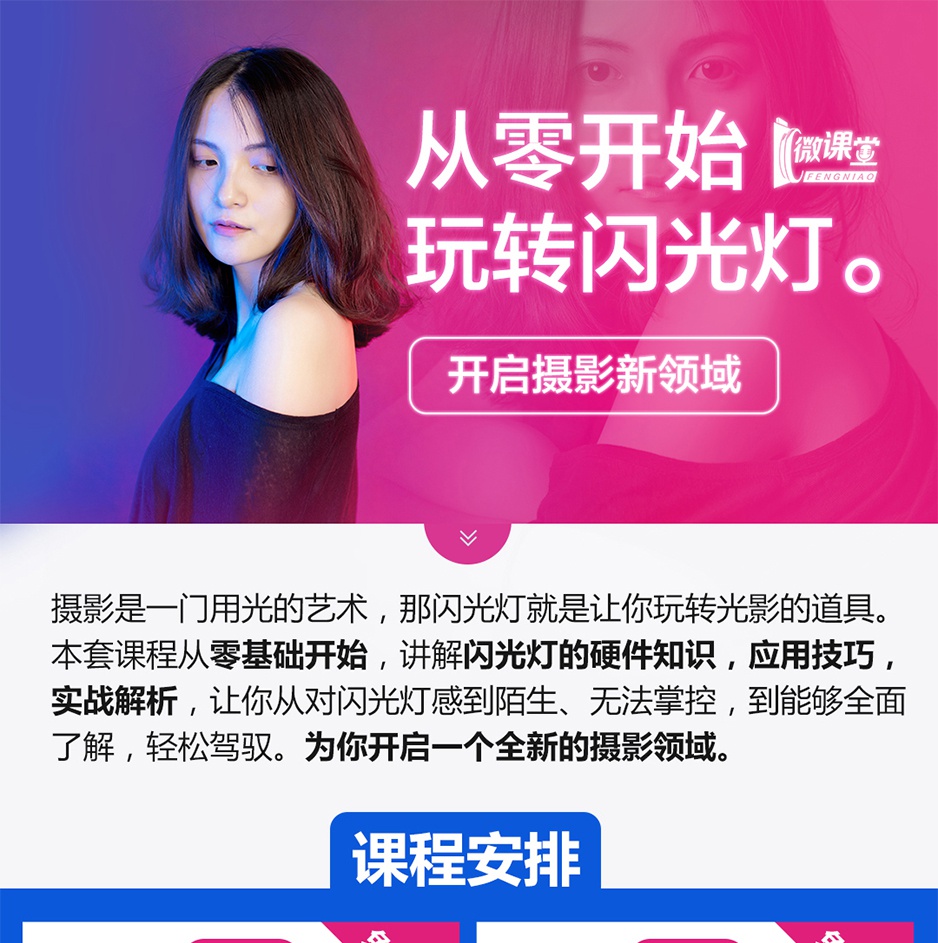 本套课程从零基础开始,讲解闪光灯的硬件知识,应用技巧,实战解析,让你从对闪光灯感到陌生、无法掌控,到能够全面了解,轻松驾驭。为你开启一个全新的摄影领域。
