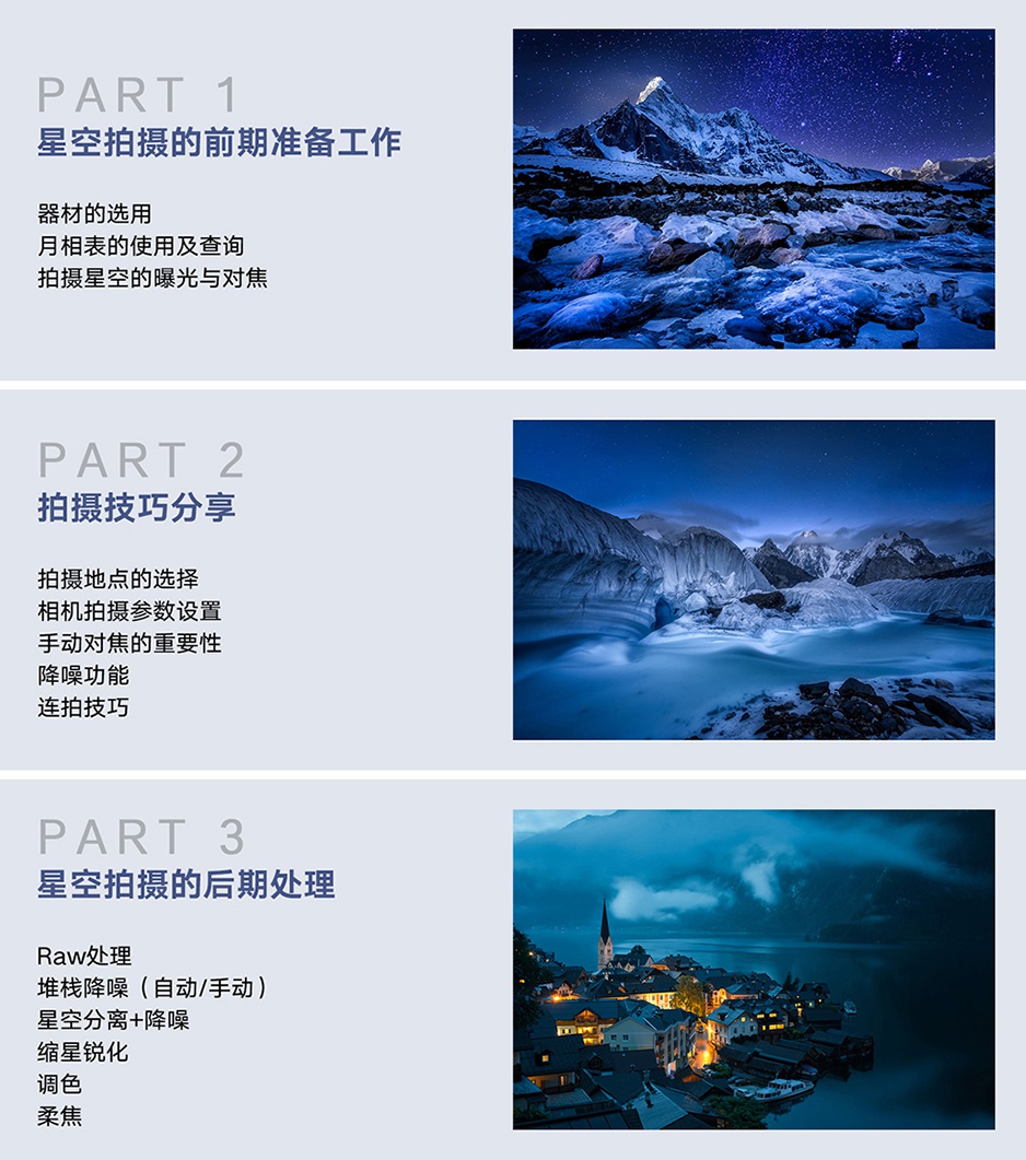 - 课程中老师以星空摄影为案例,结合相应的知识点及技巧,教你拍出属于自己的星空。