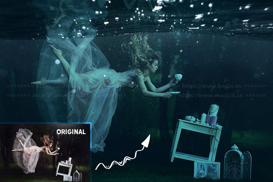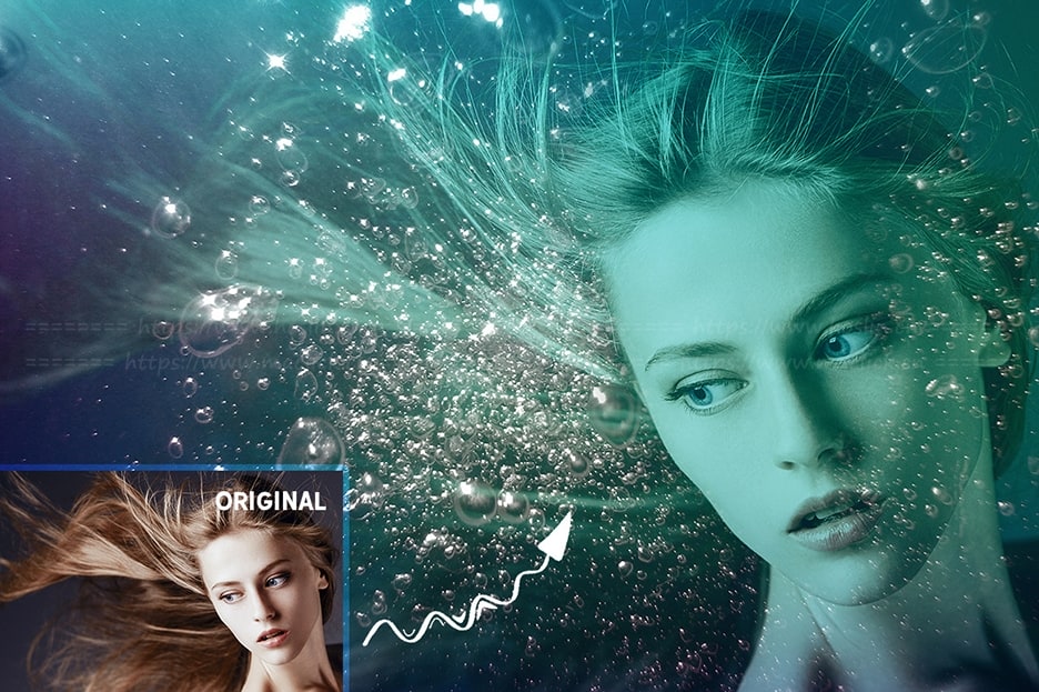 关于产品:此模板可以方便的帮您在Photoshop中创建水下摄影效果,只需拍一张合适的照片,例如,跳跃或头发飞扬,将其标记在此模板的智能图层“ PLACE PHOTO HERE”上,选择合适的纹理即可完成!
