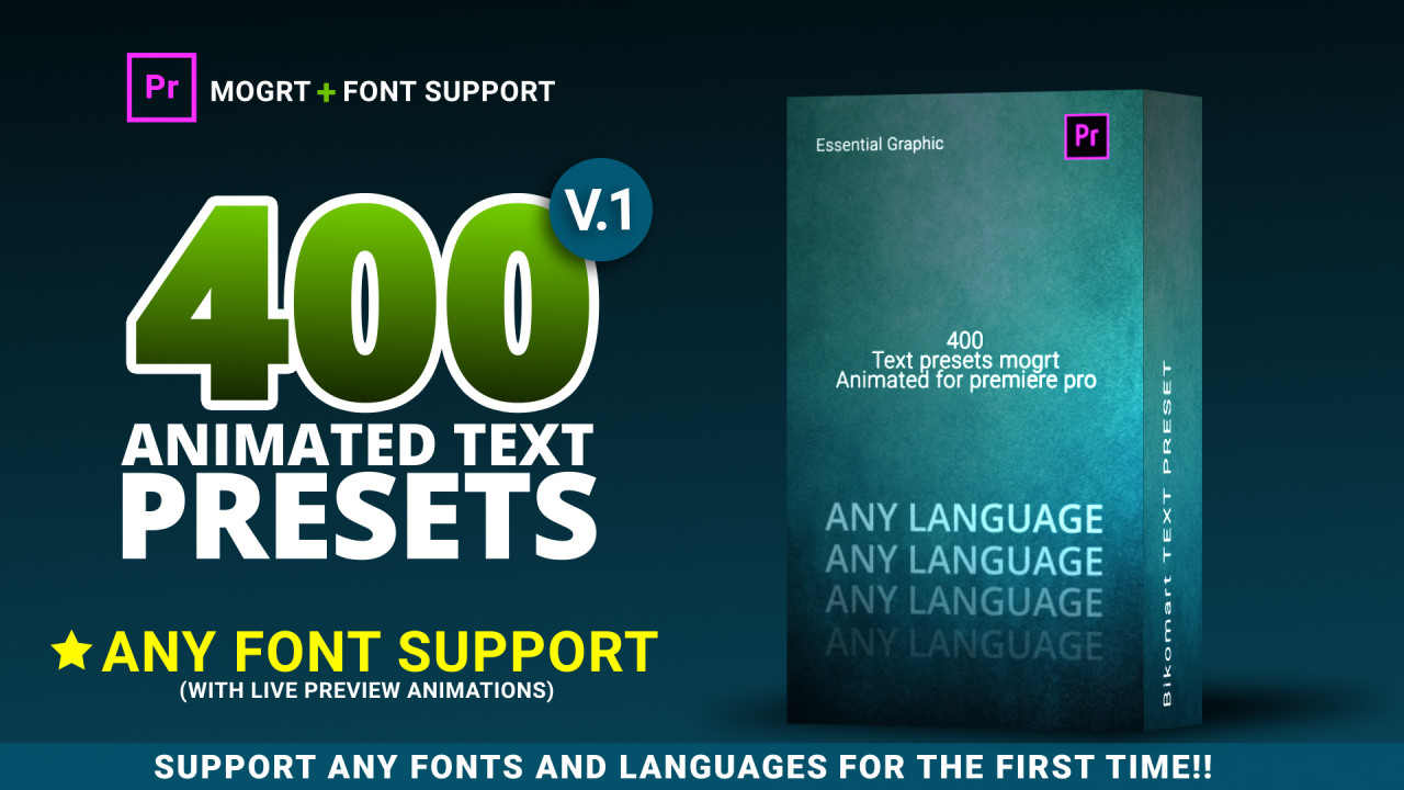 我们的文本预设支持您想要的任何字体的所有语言。这是您可以找到400个Premiere Pro文本预设的第一个。我们在15个类别中使用了2个版本。它适用于Premiere CC 2018.1和Premiere CC 2019或更高版本。要更改字体,您需要Premiere 2019及更高版本。
