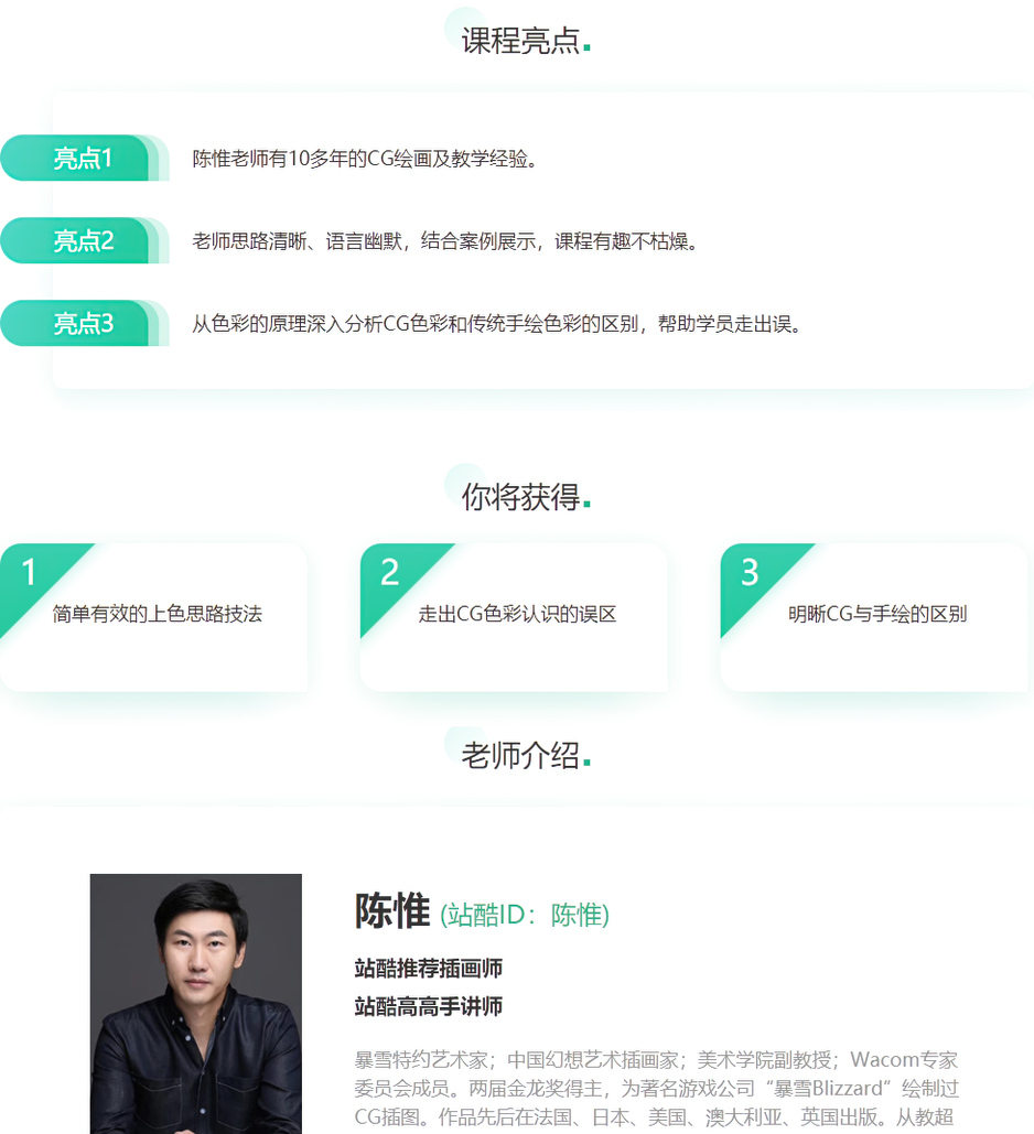陈惟老师将在本课深入讲解CG色彩的原理,并分析CG上色中的分层上色法和整体罩染上色法的各个技术环节,帮助学习者重新认识CG色彩,为学习者提供简单有效的上色思路和技法,解决CG色彩问题。课程目录: