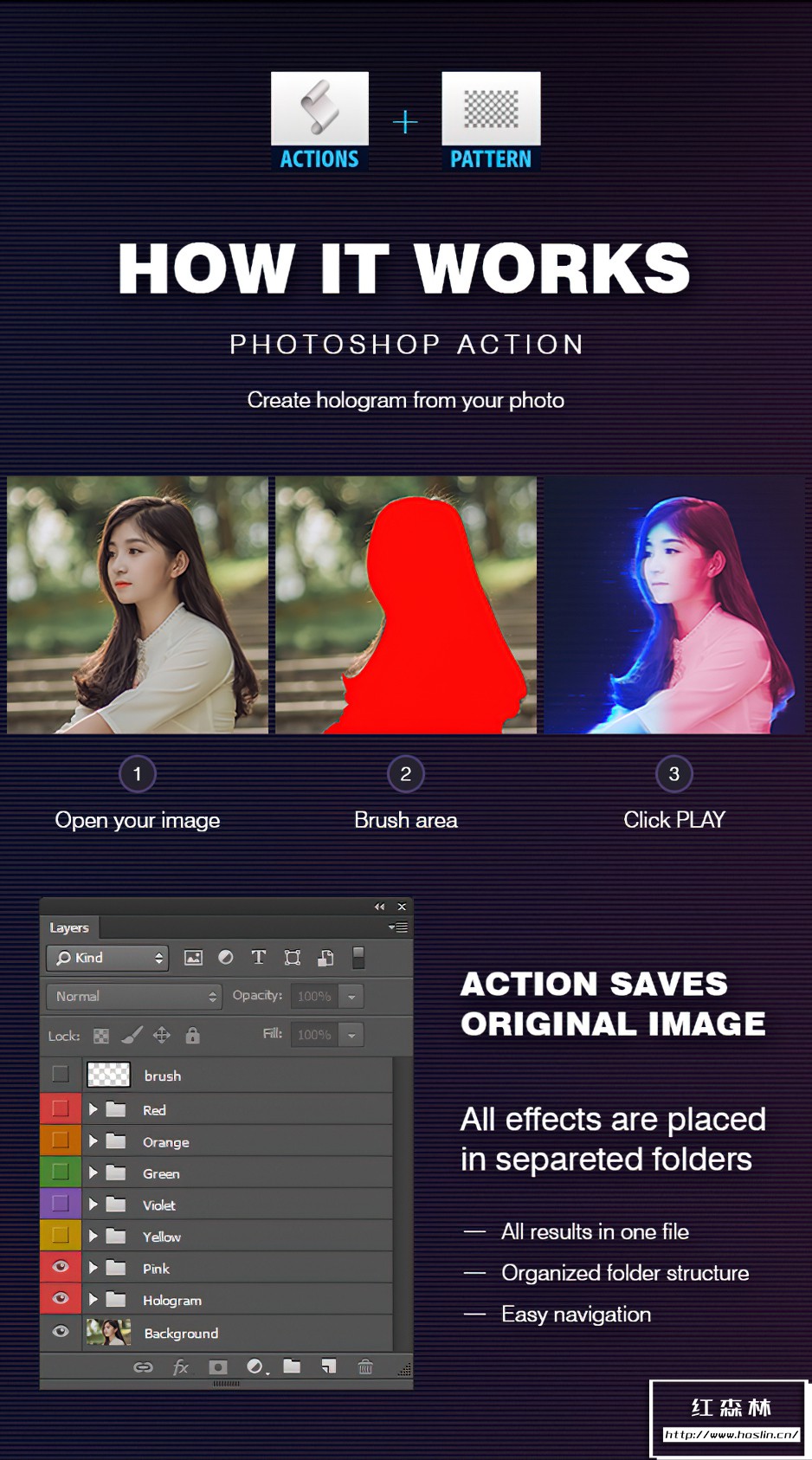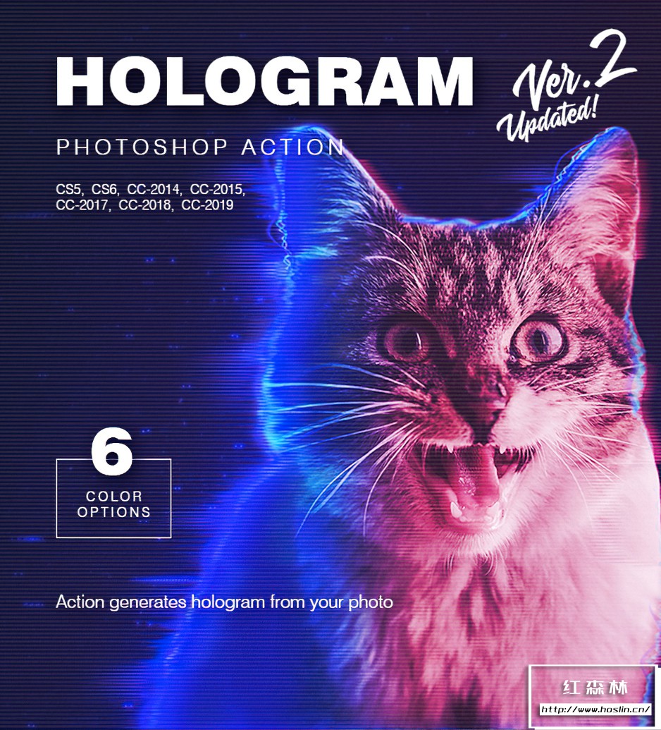 Hologram Photoshop Action 是一款炫酷的照片转全息摄影图像PS特效动作,全息摄影效果PS动作能够快速为您将图像转换为全息摄影效果。动作使用简单,只需在PS中导入图片,在图片背景层上方新建一个空白图层,使用画笔工具涂抹出您想要施加效果的区域,然后执行动作,一秒就可以看到效果。