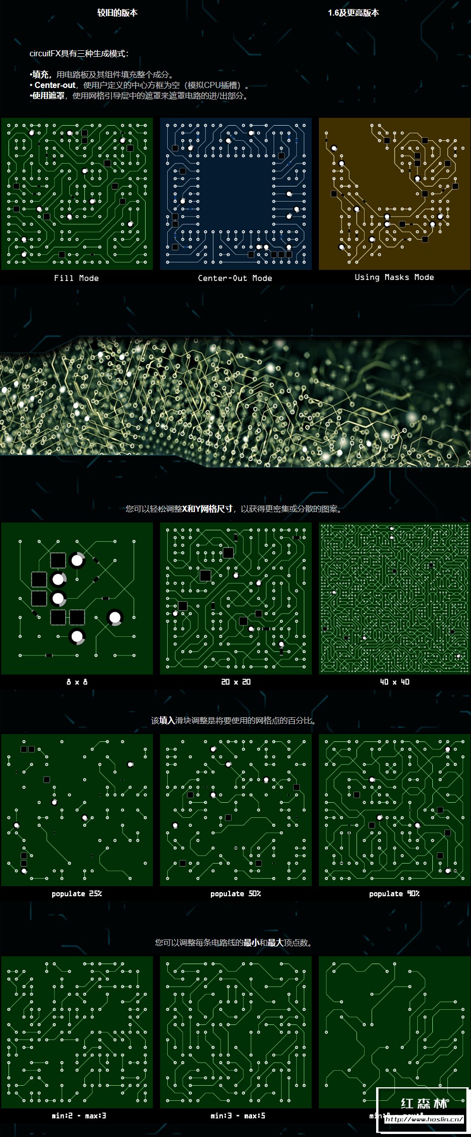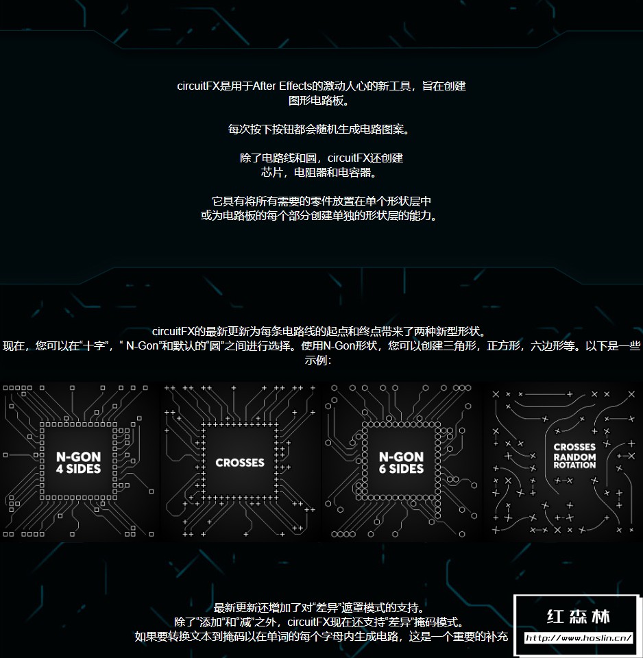 AEscripts circuitFX V1.7是一款After Effects高科技图形电路板电流动画脚本,可以随机生成电路图案。circuitFX还创建芯片,电阻和电容。它具有将所有需要的部件放在单个形状层中或也可以为每个部分创建单独的形状层。