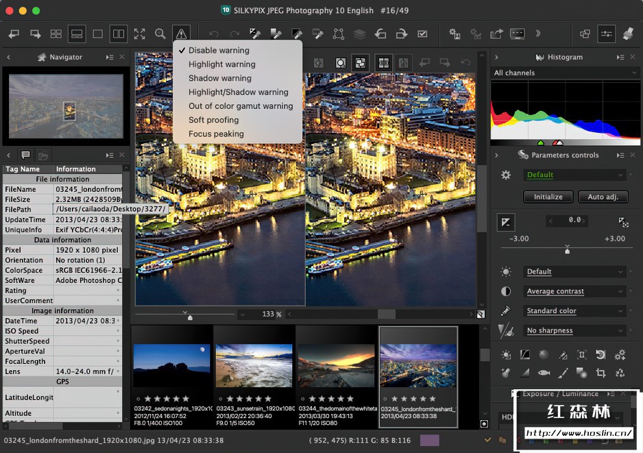 在显示器上预览由于纸张质量而引起的差异:SILKYPIX提供用于监视器查看或打印的颜色管理,包括一个“打印机校样”系统,可让您模拟ICC配置文件中的打印结果。*需要支持颜色管理的显示器。