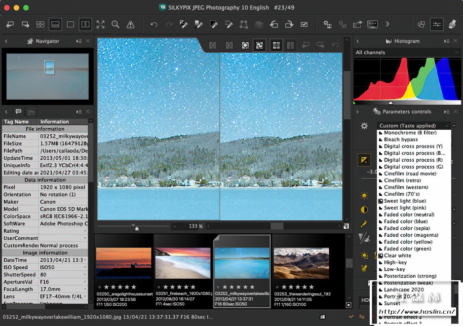 轻松创作艺术品:“Taste”功能使您只需单击即可创建各种艺术表现形式。SILKYPIX定制了66种“Tastes”,使初次使用的用户只需打开“下拉列表”并选择所需的“Taste”即可轻松完成工作。此外,通过在“Tastes”选择之后进行调整,您将能够创建自己的原创作品。