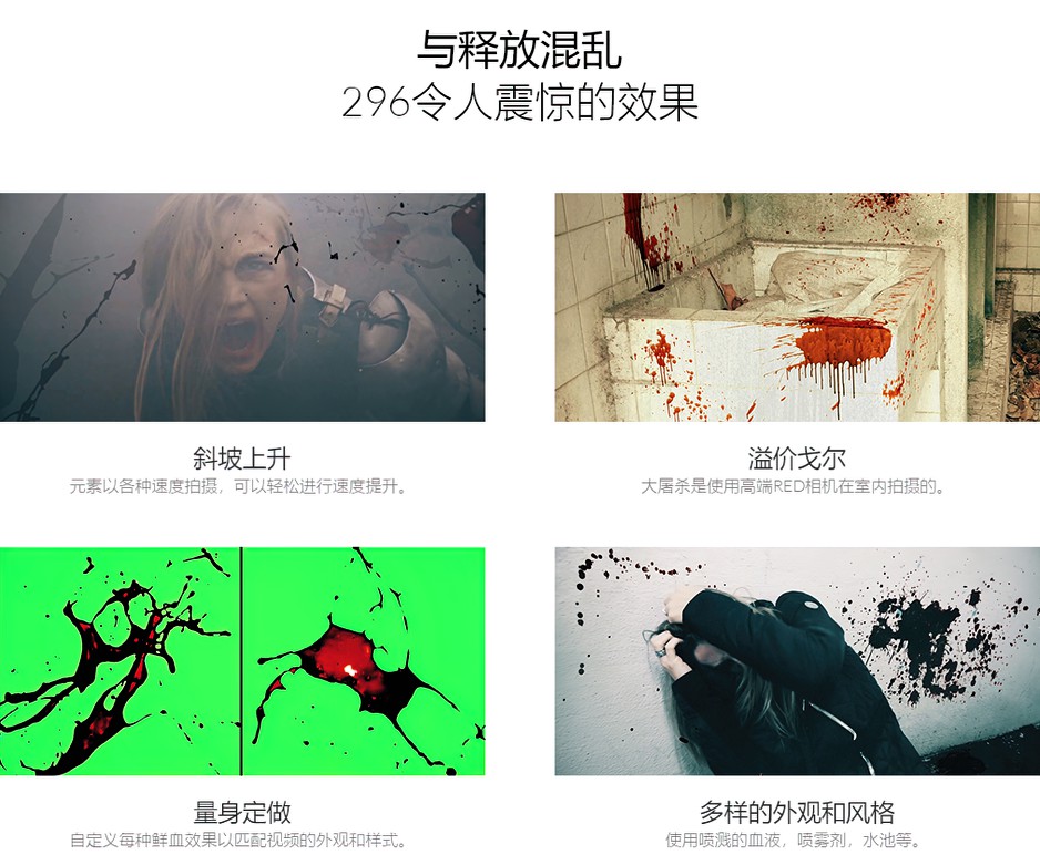 这套素材共包含296个滴血血液喷溅血迹绿幕特效合成4K视频素材;MP4格式,无透明通道,原始绿幕背景视频素材,需要你自己完成抠像。借助Carnage Blood Effects,您可以准备对自己的恐怖,犯罪和动作场景造成严重影响,Carnage Blood Effects 是您自己的拥有290多种内脏血液效应的个人资料库。