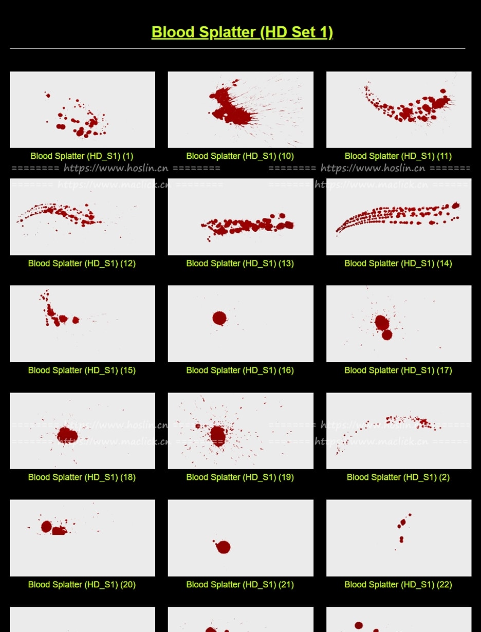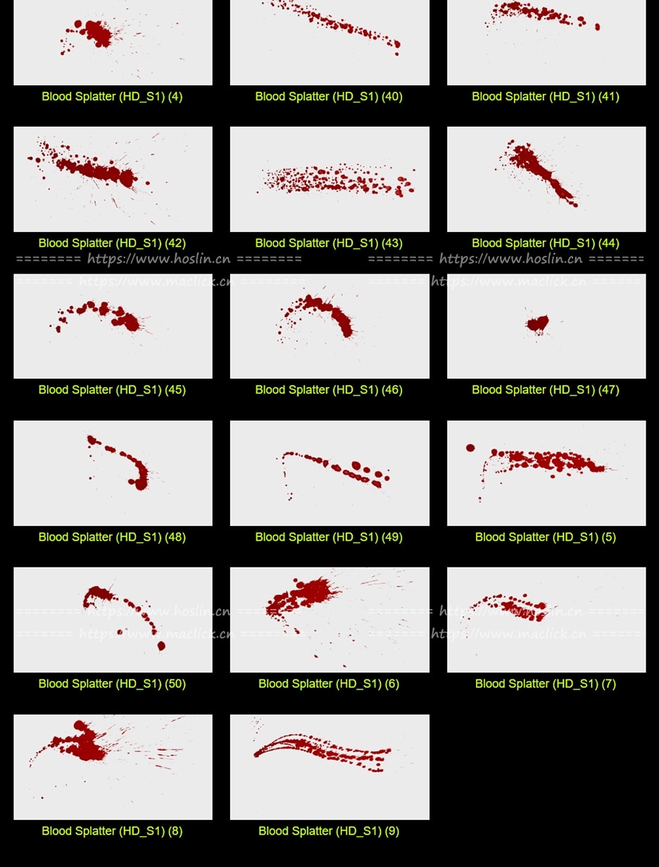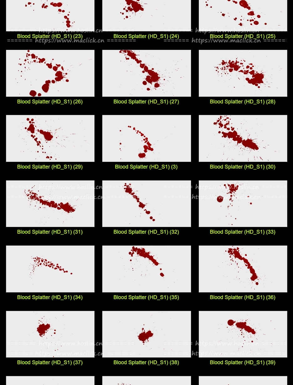 此素材含50个红色血液飞溅喷洒飙血通道视频素材,可用于电影,广告,音乐视频,视频艺术,LED屏幕,视频投影贴图的血液飞溅剪辑合成等。包含透明通道,还提供了41张血液静帧通道图片。