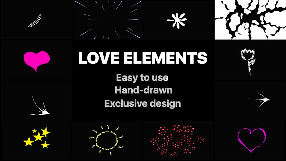 Love Elements是一款很酷的MG运动图形包,其中包含16个独特设计的动态动画卡通元素。包装中的物品包括心形,花朵,爆裂效果,超速效果等。这款4096×2160(4K)的包装非常易于使用,并且可以快速设置素材的样式以匹配您自己的项目。