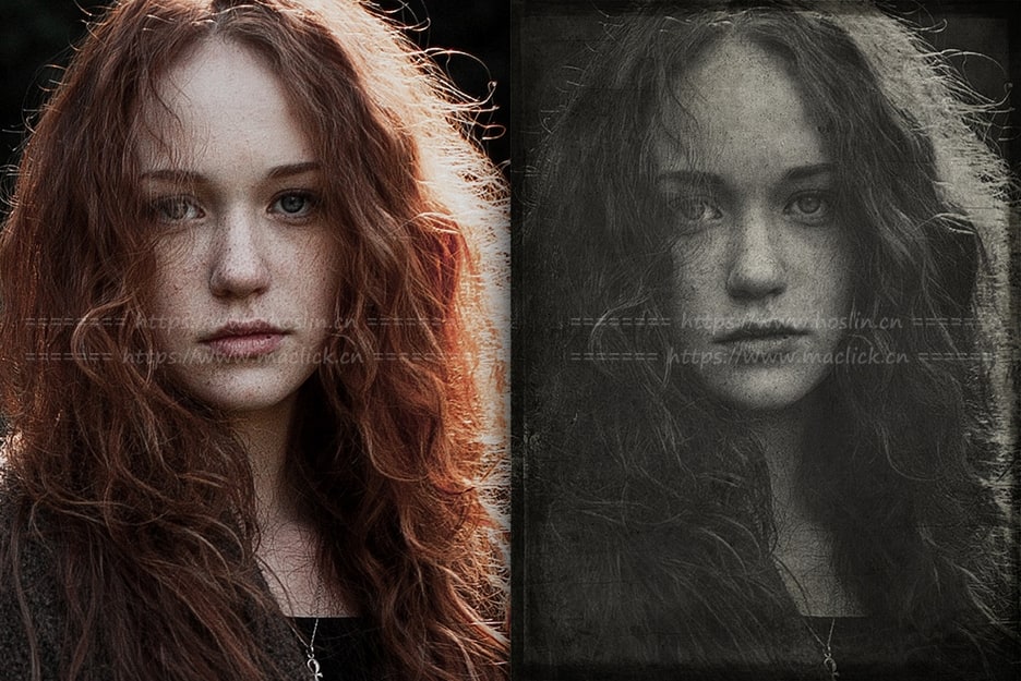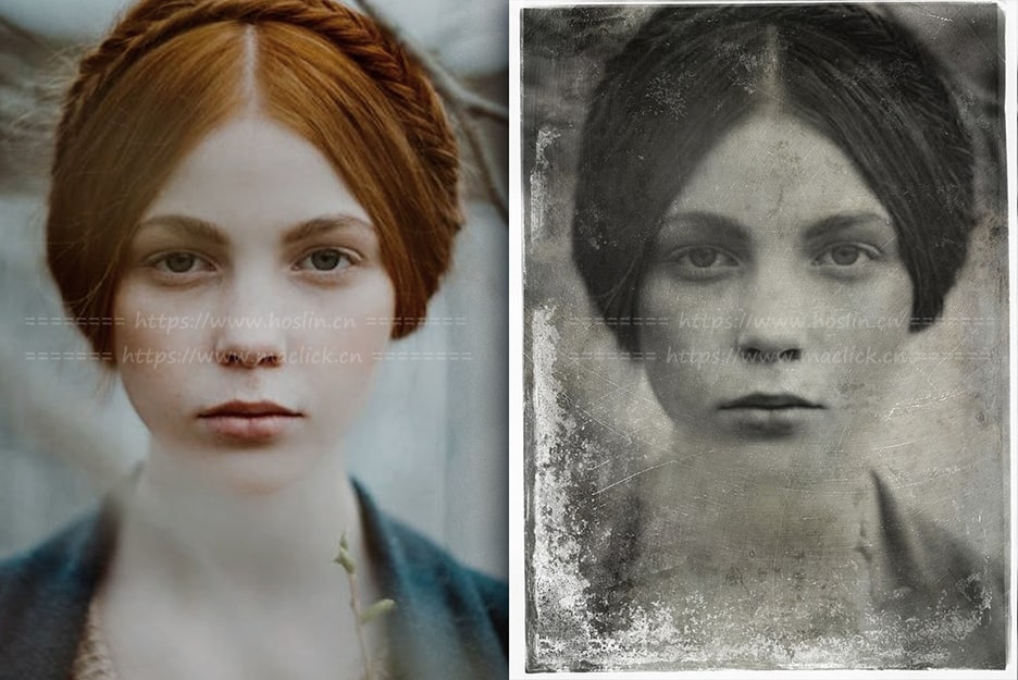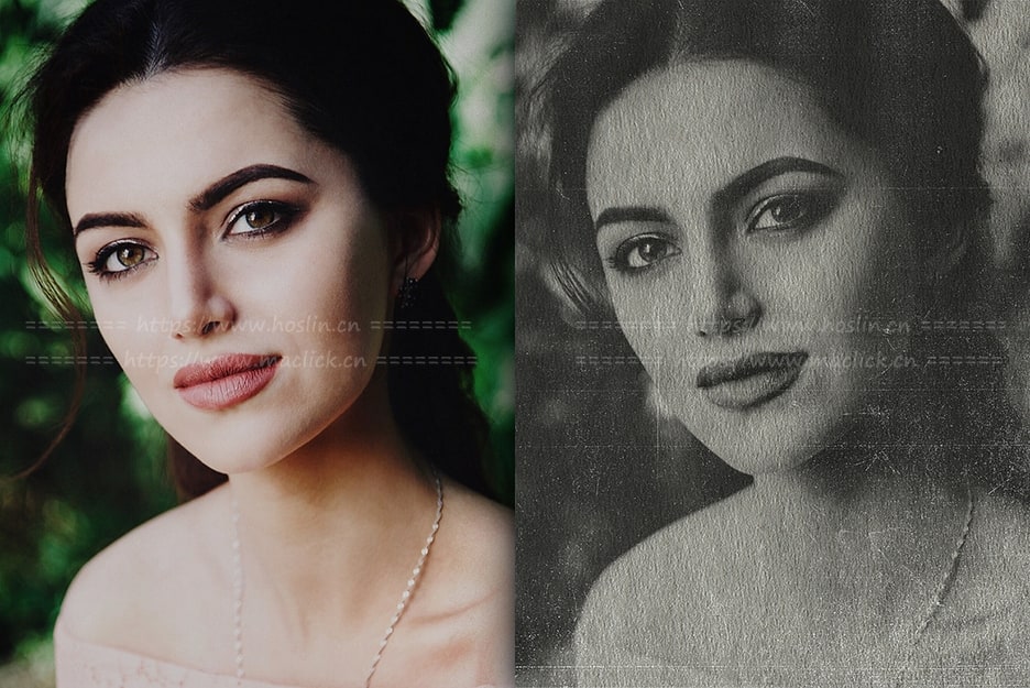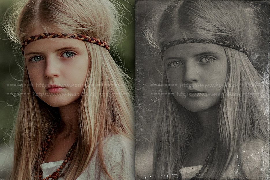 只需想象一下,只需单击两次即可将任何照片转换为旧专辑的复古风格。您还可以使用制作此效果的PS动作,您将获得经过微调的色彩校正,它肯定带有旧的黑白照片的阴影和两组纹理,以模拟照片表面的复古纸和划痕。