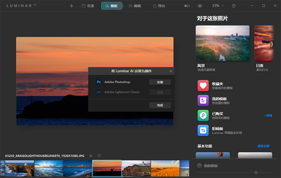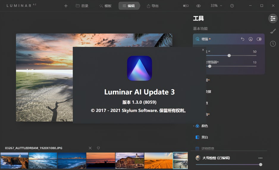 这是一款”号称”全球第一个完全由人工智能支持的图像编辑器,AI自动识别图片并推荐出合适的调色滤镜。可以AI瘦脸、美化皮肤、一键瘦身、一键换天空、一键丁达尔等,软件功能非常丰富。使用Luminar AI,让你能够创建既有趣又令人惊讶引人注目的照片。使用Atmosphere AI,以3D深度添加逼真的大气效果-雾,雾,霾,蒸汽,毛毛雨。无需面具和图层即可营造出神奇的氛围。