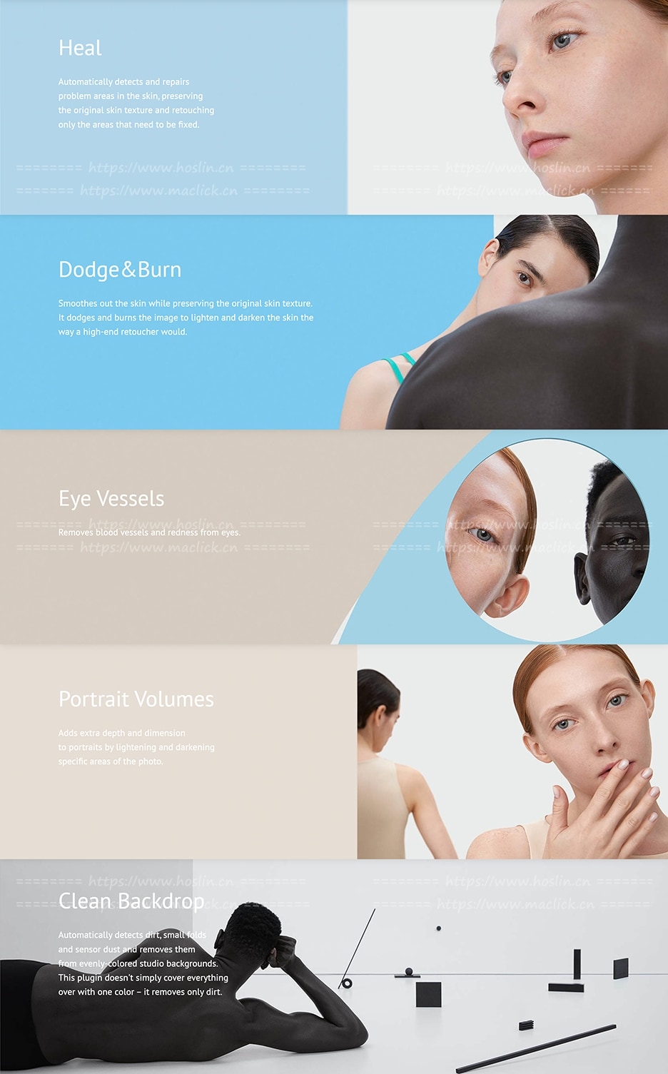 - 高端皮肤修复:Retouch4me Dodge&Burn 使用高端修饰器使用的减淡和加深技术自动修饰人像。