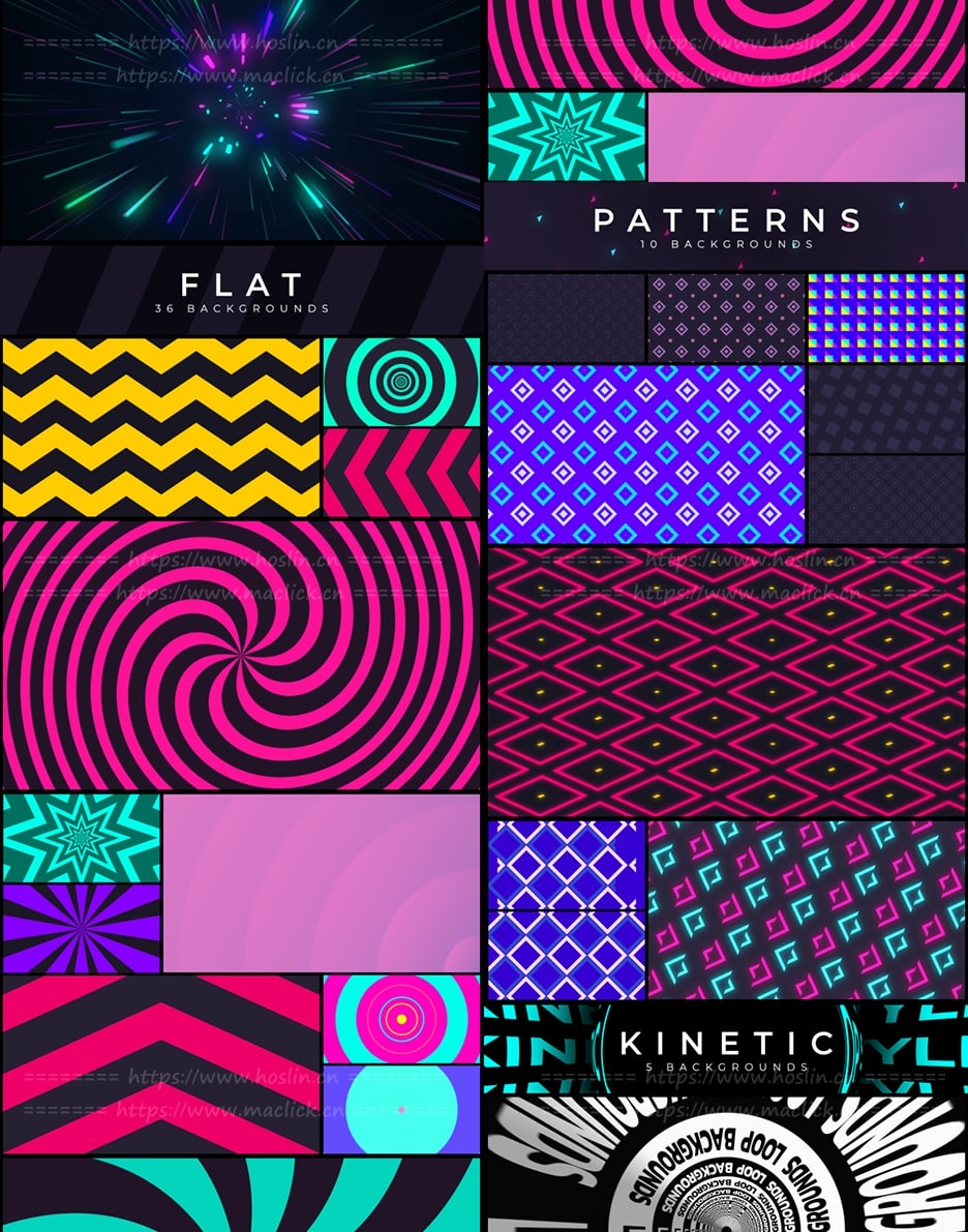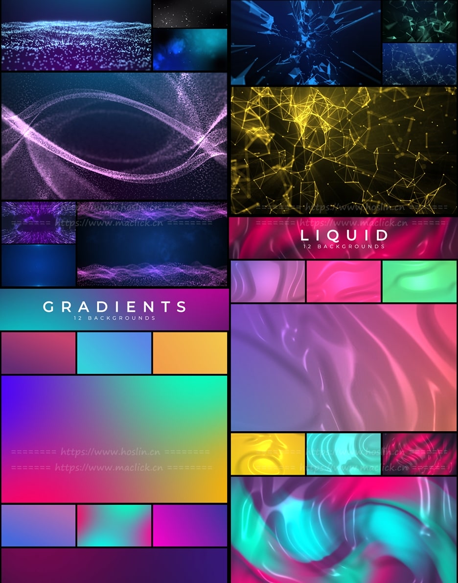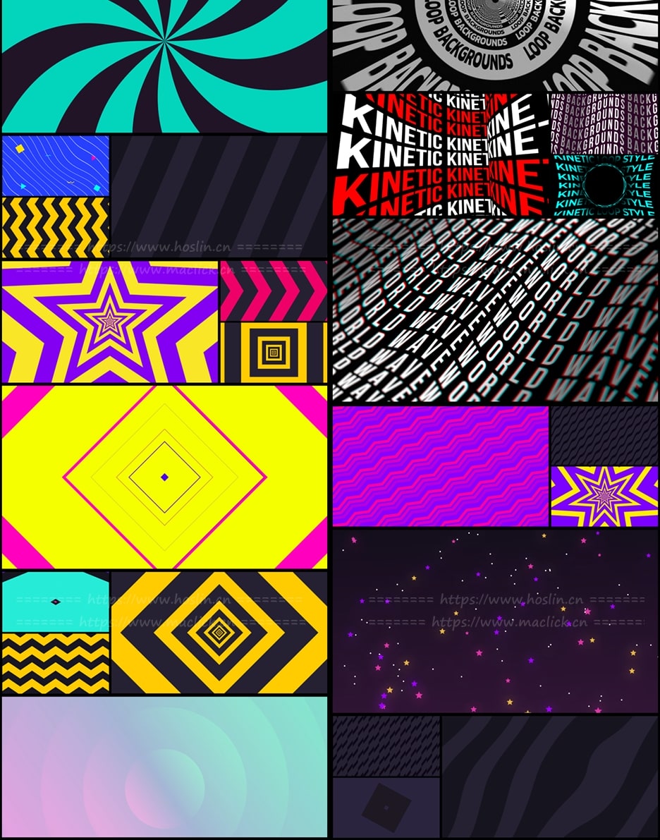 150个漂亮彩色渐变图形背景循环动画 Loop Backgrounds,12个不同类别的150个循环动画背景,可轻松更改各种颜色,支持任意分辨率,无需第三方插件工作。包含官方使用视频教程。12种类别:
