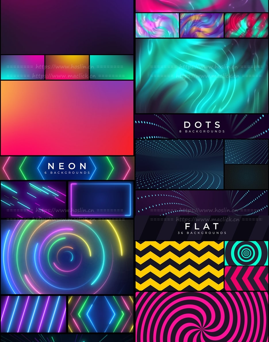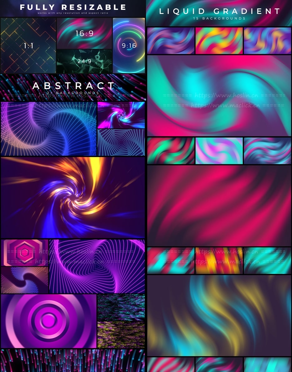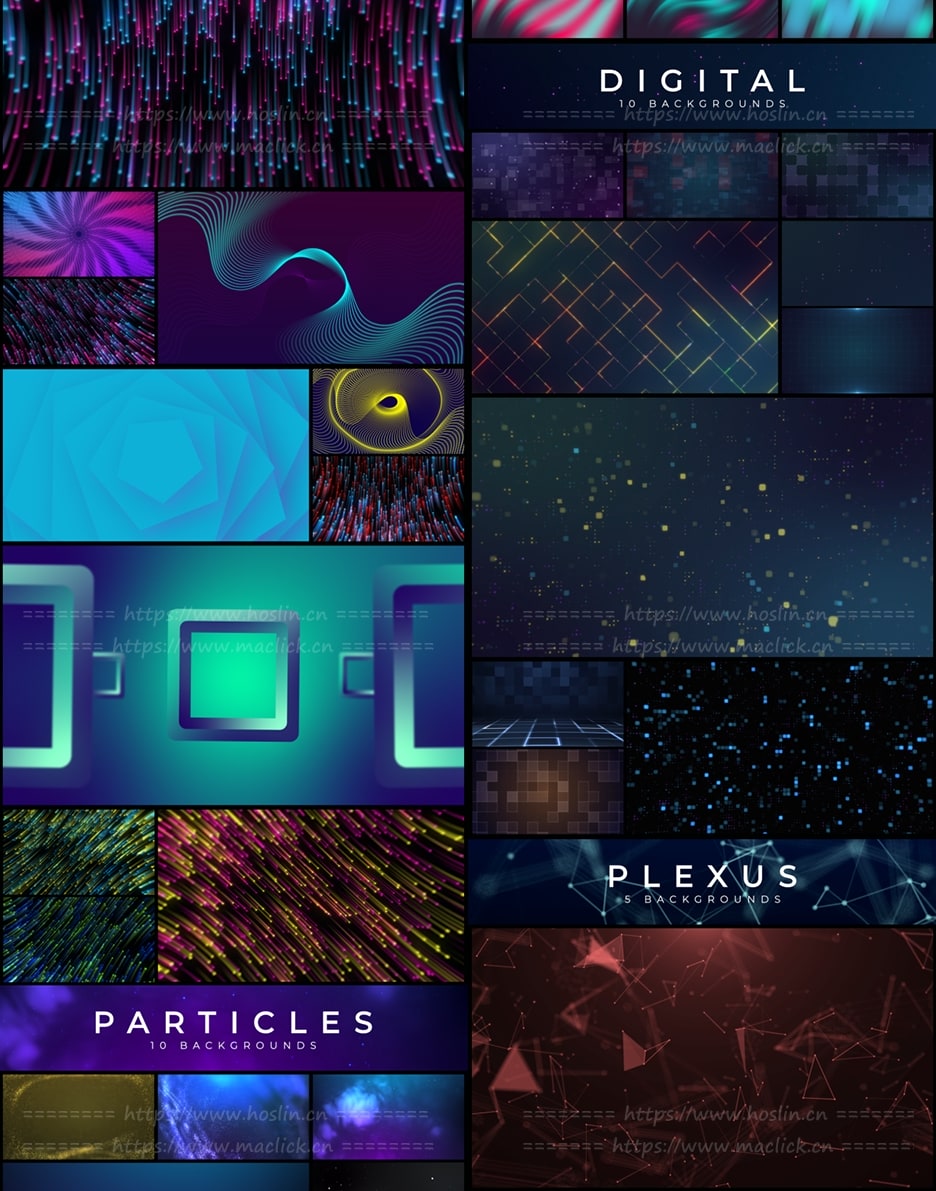 150个漂亮彩色渐变图形背景循环动画 Loop Backgrounds,12个不同类别的150个循环动画背景,可轻松更改各种颜色,支持任意分辨率,无需第三方插件工作。包含官方使用视频教程。12种类别: