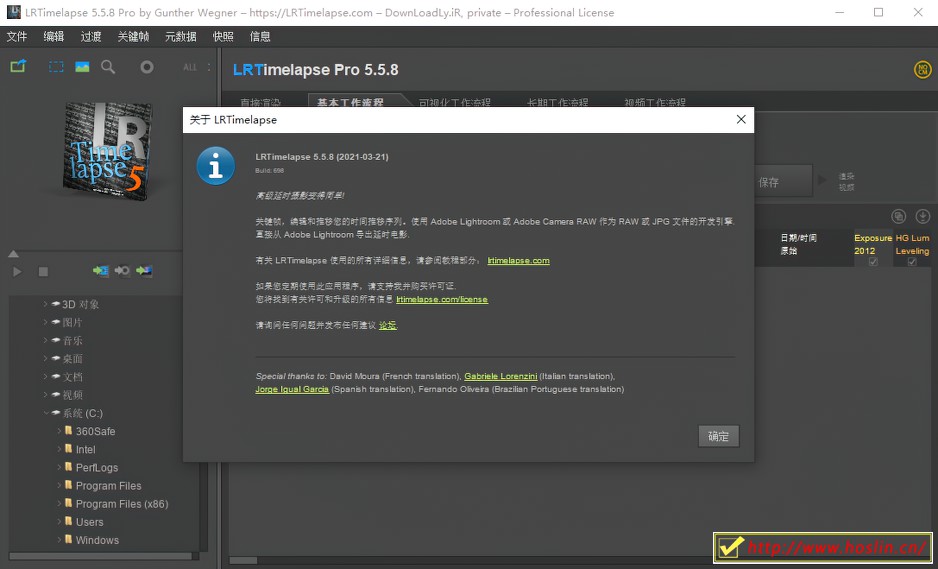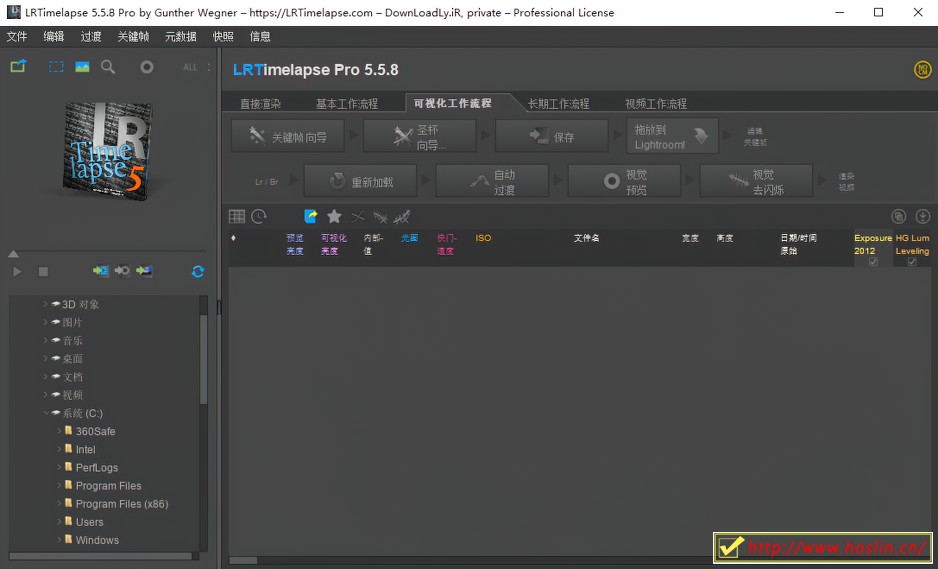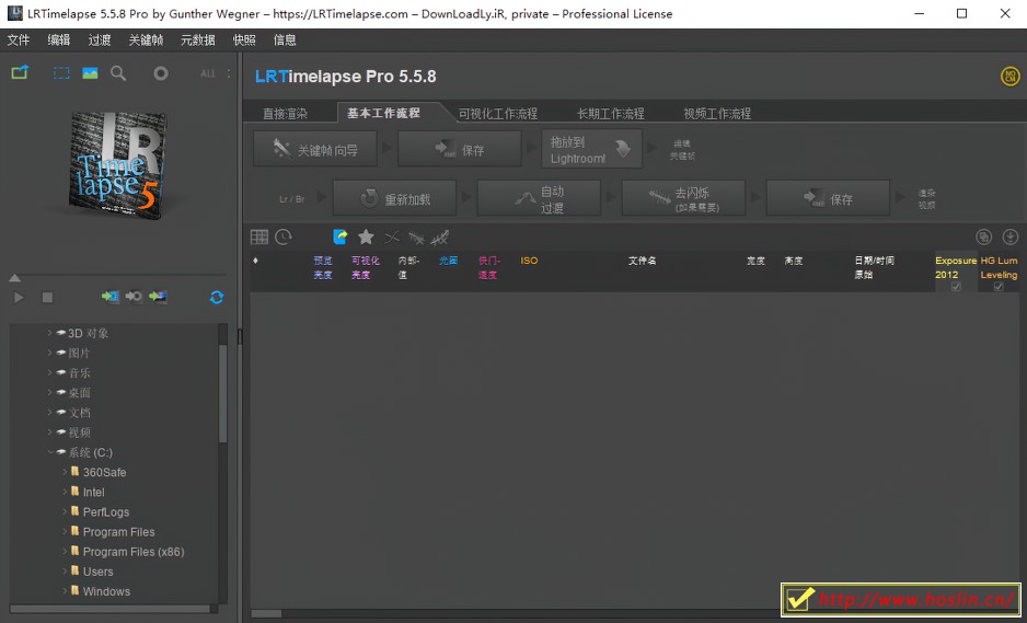 LRTimelapse v5.5.8 Build 698 Windows中文版是一款专业的延迟摄影编辑渲染工具,具有高清输出、简单易用、无缝转换等特点,程序可以配合 Adobe Lightroom, Adobe Camera RAW 和 Adobe After Effects 等程序完美配合使用用来制作延时摄影, 可以做到平衡曝光不一致( 去除闪烁等现象)关键帧参数自动过渡的功能。是非常强大的一款延迟摄影工具! LRTimelapse Pro可以将您的影片提升一个水准。此外,LRTimelapse Pro 也是为你的延时电影抗闪烁的最好的工具之一。
