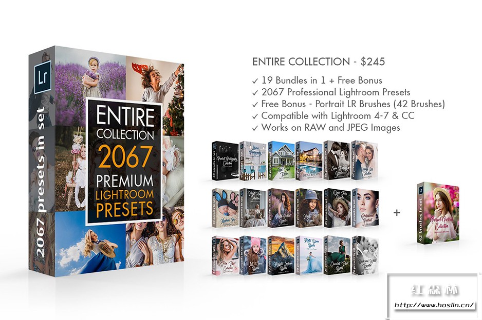 整个系列 Lightroom 预设:黑白基本预设、巧克力 Lightroom 预设捆绑包、暗电影 Lightroom 预设、电影效果预设、新生儿 Lightroom 预设、哑光梦幻预设、哑光人像预设、专业哑光预设、产品摄影预设、室外建筑摄影、建筑 HDR 、室内 Lightroom 预设、棕褐色幻想预设、复古爱情预设、婚礼经典预设…等。预设文件夹已简单中文翻译,方便查找使用。