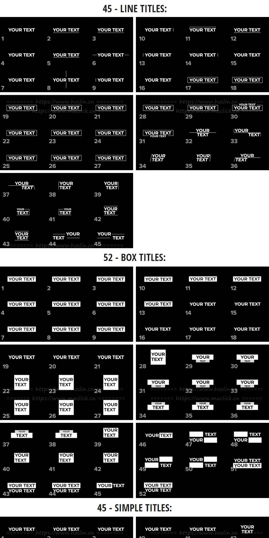 包含内容:4个类别共200个标题,包含AE Project文件和.mogrt文件。以及一组视频使用教程。