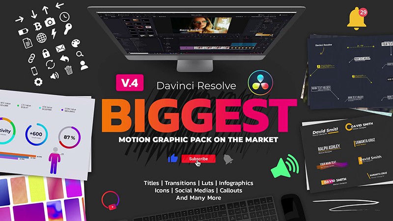 新发布的Davinci Resolve v.4 动态图形包新增了如下内容:50个声音 FX、25 个光晕、15 个动态标题、15 个分屏、10 个幻灯片。修复了一些小错误。