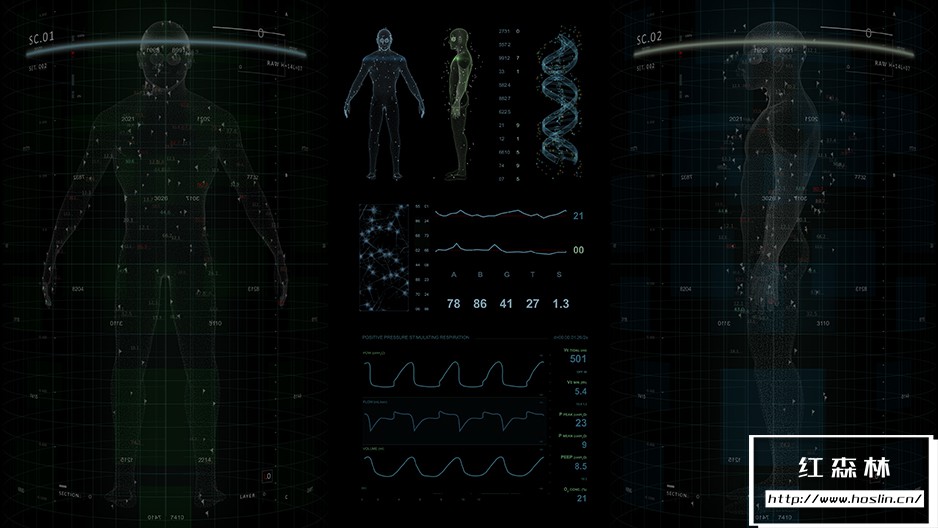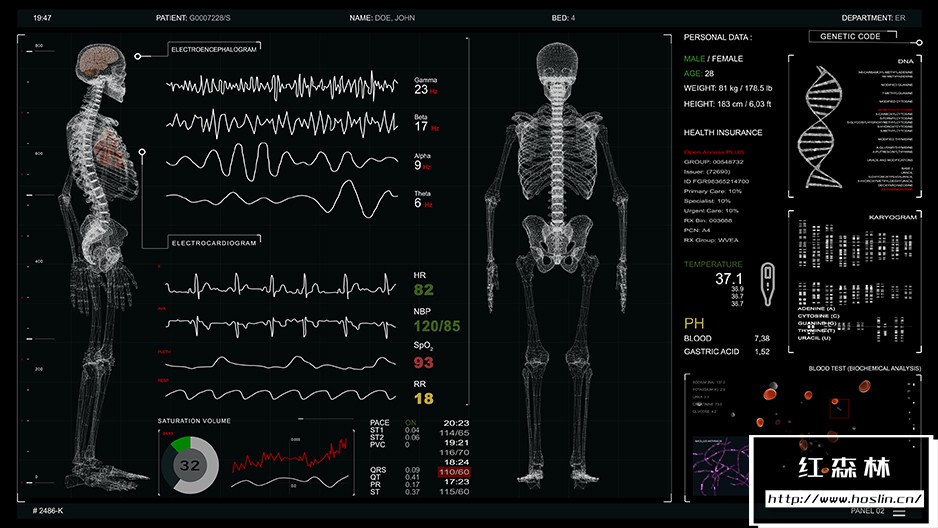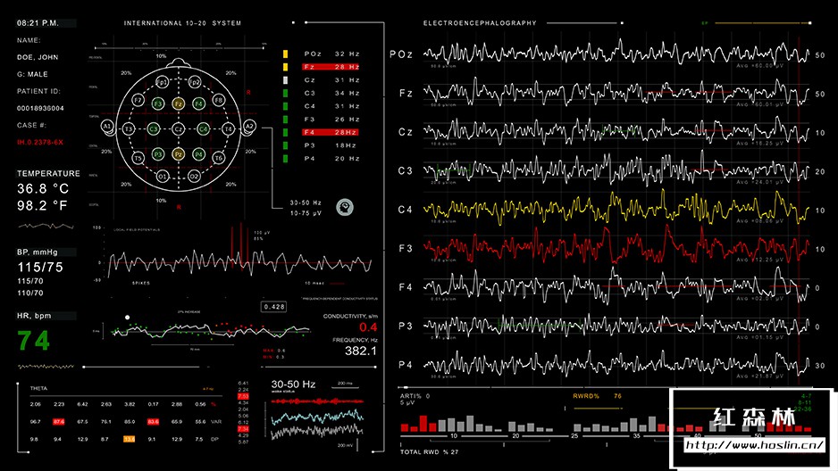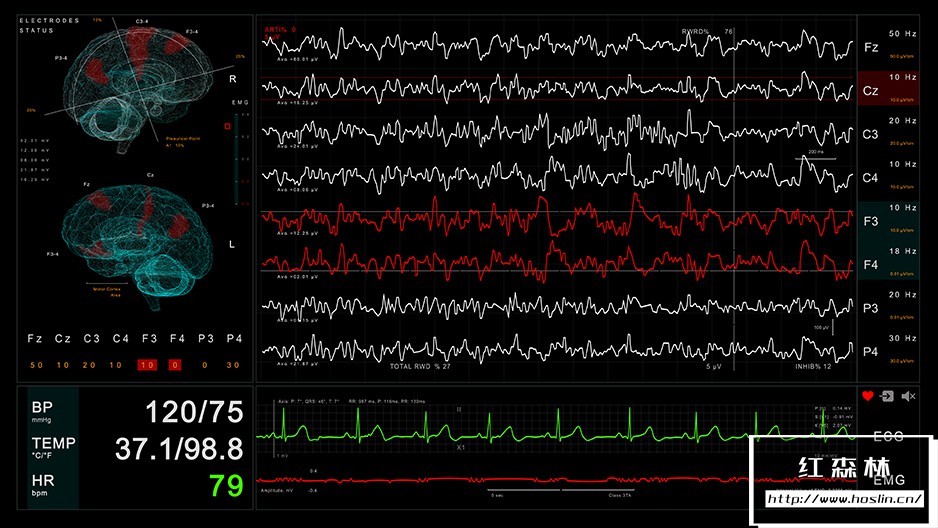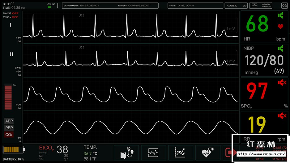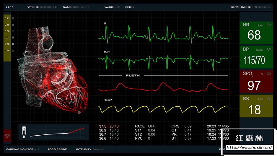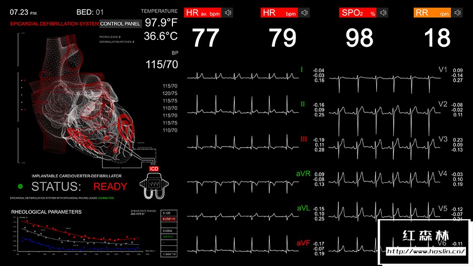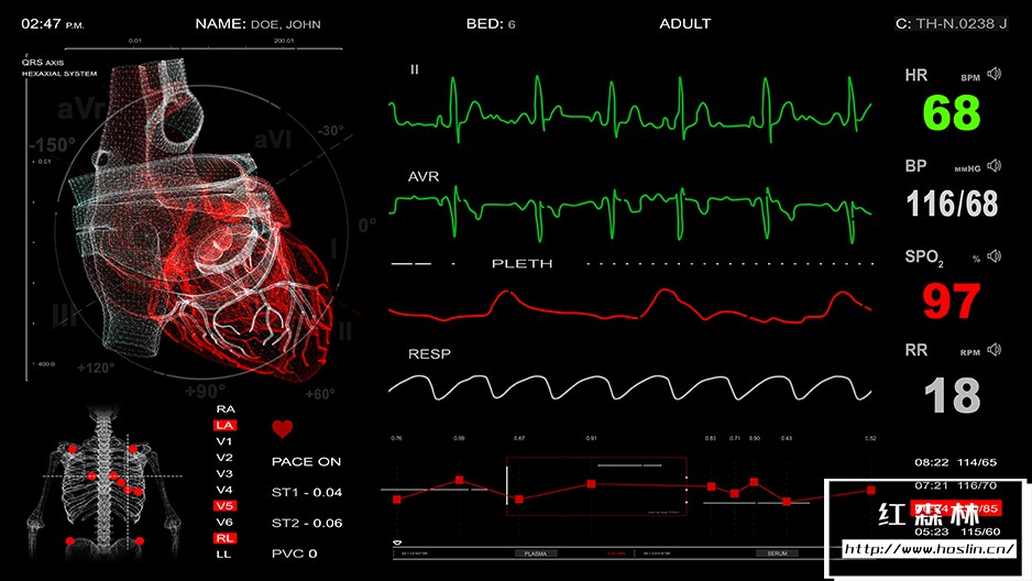 Screen 02/cardiac monitor包含5种不同的ECG曲线:正常、心动过缓、心搏停止/死亡、心室颤动、室性心动过速,每一种都可以在项目中轻松选择。