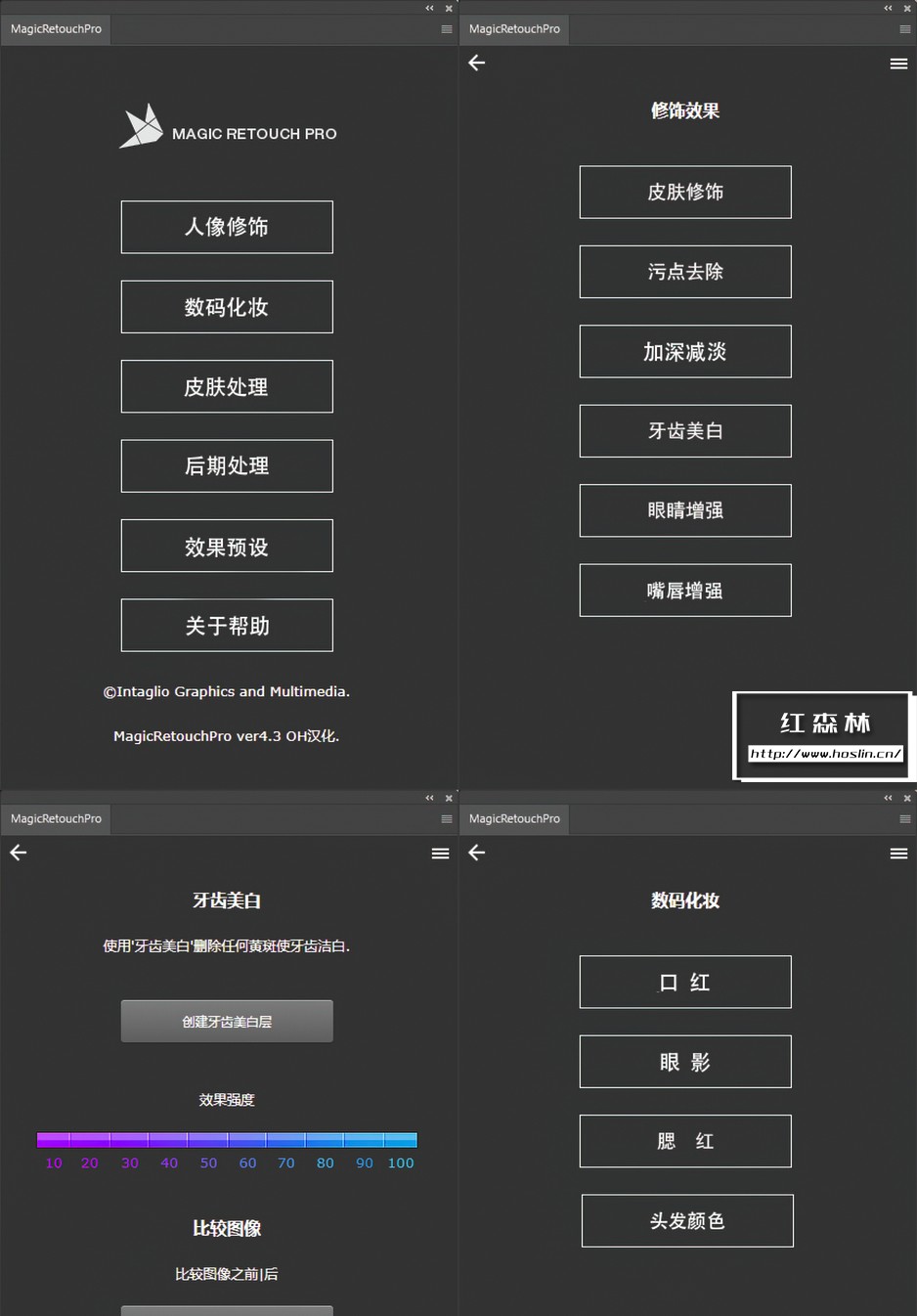 Magic Retouch Pro 4.3汉化中文版是一个 Photoshop 扩展插件,即使您没有任何修饰的知识或经验,也可以做专业级修饰。Magic Retouch Pro 是完美的新手用户,同时也给更有经验的用户节省时间的工具。Magic Retouch Pro 有强大的工具集, 如皮肤修饰, 牙齿美白, 眼睛增强, 嘴唇增强, 数字化妆, 皮肤外观和效果预设。