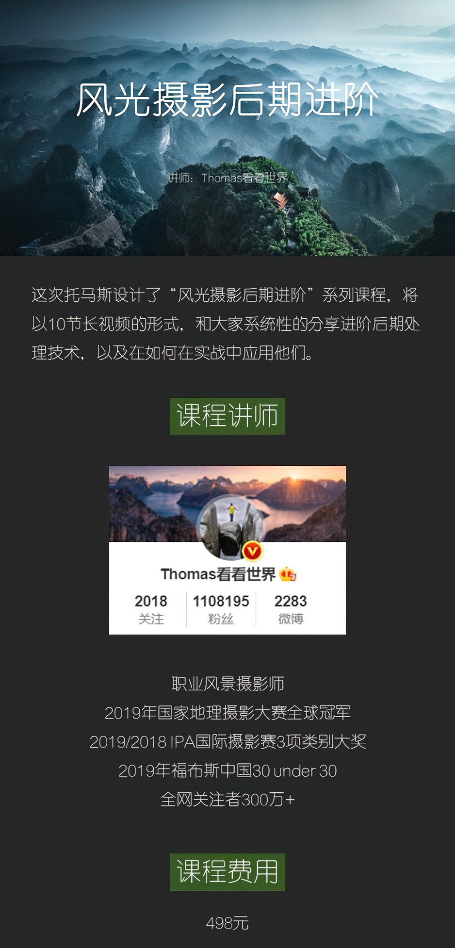 - 本次课程将会系统性的讲解风光摄影进阶后期技术,这些技术都是国际上一流的旅行风光摄影师们正在使用的,干货程度爆表。课程讲师作为2019年国家地理摄影大赛全球大奖得主,以及图虫、微博、知乎等平台最热门的风景摄影师之一,专业技术过硬。