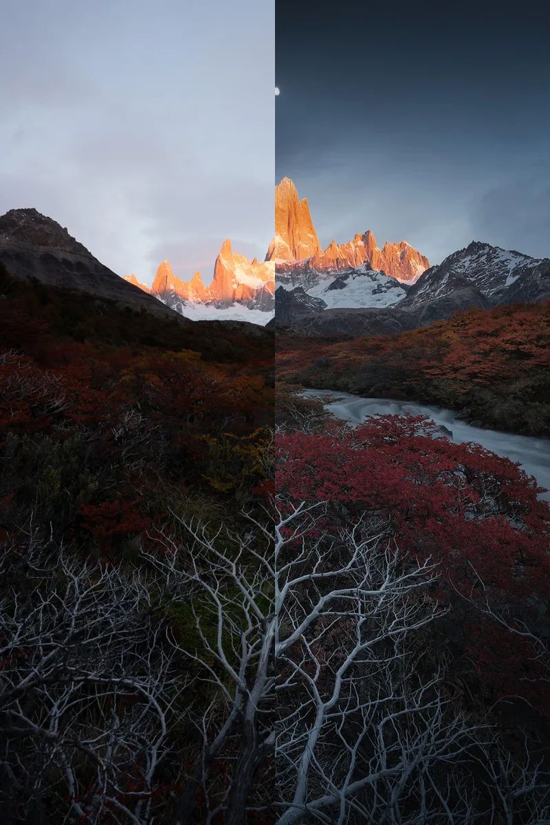 第八课:实战案例 《巴塔哥尼亚秋色》知识点:风光摄影对焦(对焦点、超焦距、手动对焦、景深合成对焦)、RAW处理、冷色天空的制作、通过色彩与明暗压制杂物、局部色彩强化、纹理强化、通过变形二次构图、舒服而不过艳的色彩