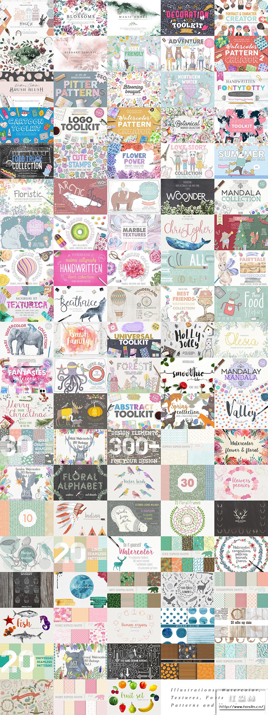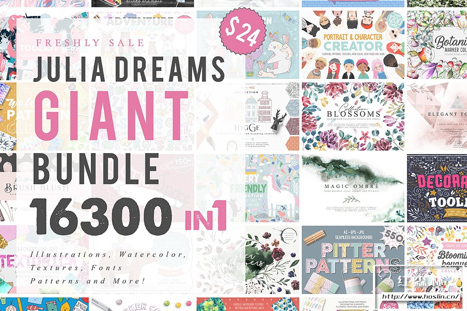 关于产品:1个巨型捆绑包中的16300 个图形元素:这个巨型套装包括大约 16300 个素材。它是水彩元素、标记元素、插图、对象、图案、纹理和字体。
