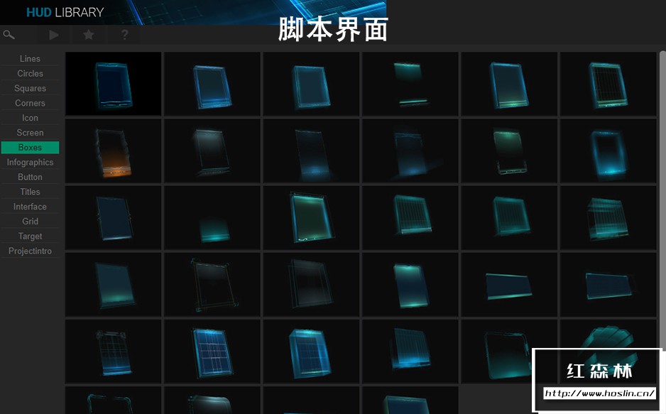 HUD Library V2.1 扩展脚本提供了640个科技感线条屏幕边框UI界面元素动画预设,如:线条,圆形,方形,倒角,图标,屏幕框,方框盒子,数据,文字,网格,场景动画等。使用扩展脚本可直接预览动画,点击即可使用预设加载到合成中。包含详细的脚本安装和官方使用视频教程。