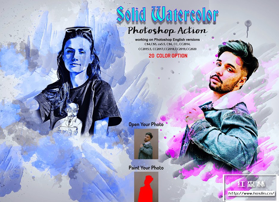 关于产品:固体水彩 Photoshop 动作,此动作效果旨在将您的照片转换为真正的纯水彩外观。有了这个专业特效包,您可以将普通照片变成非凡的图像。易于定制,无损效果。在这个动作中,当你睁开看不见的眼睛时,你会得到 20 种不同的颜色选项。你可以很容易地改变颜色。
