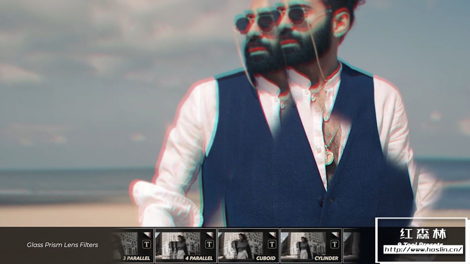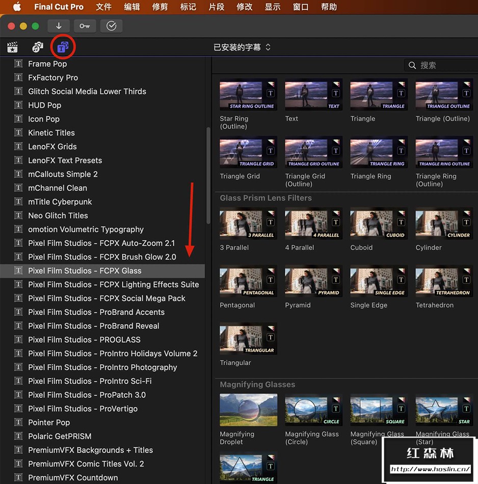 - 玻璃棱镜滤光片:FCPX Glass 包括玻璃棱镜镜头过滤器,让用户可以为抽象风格的叠加添加棱镜形状折射工具。
