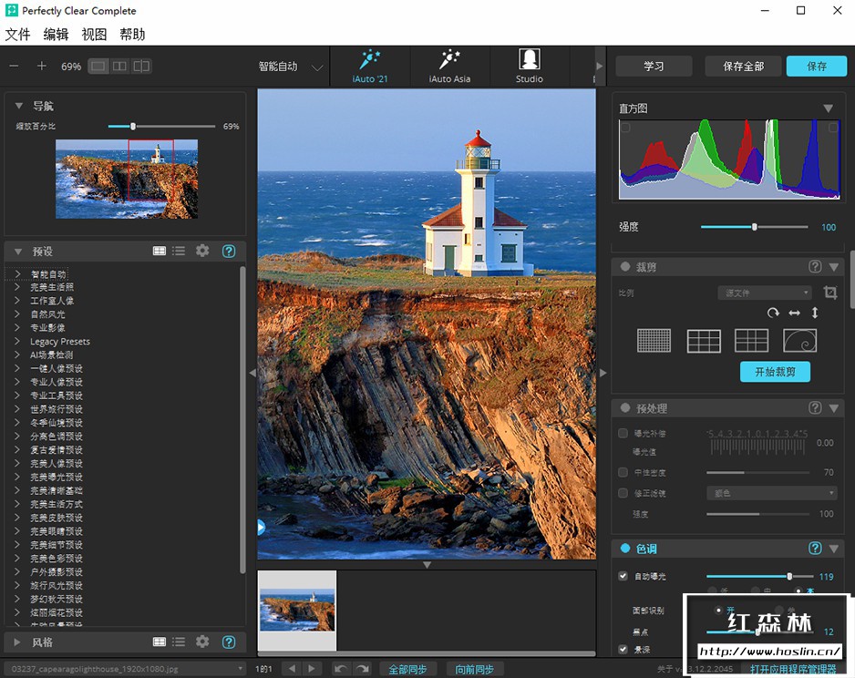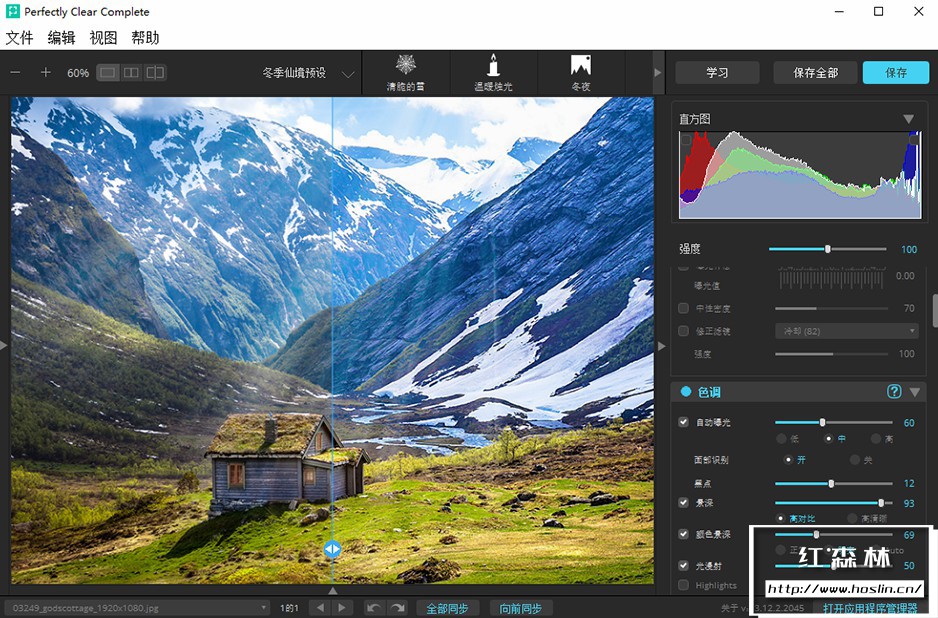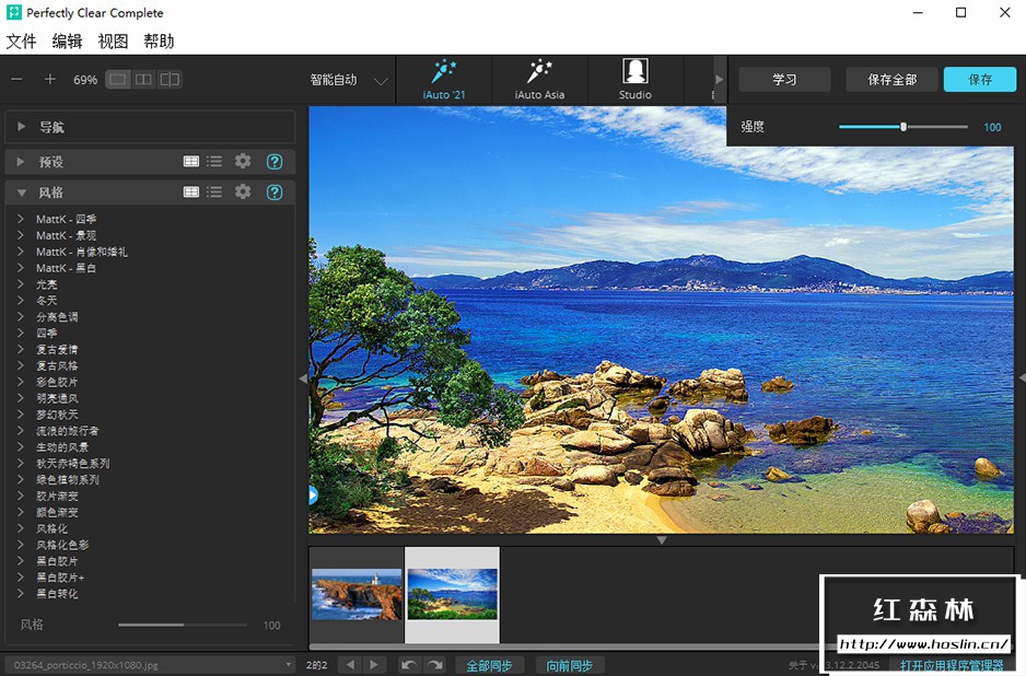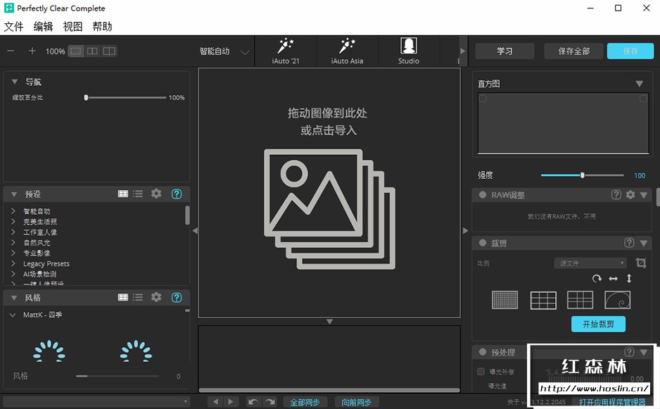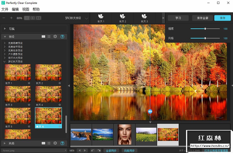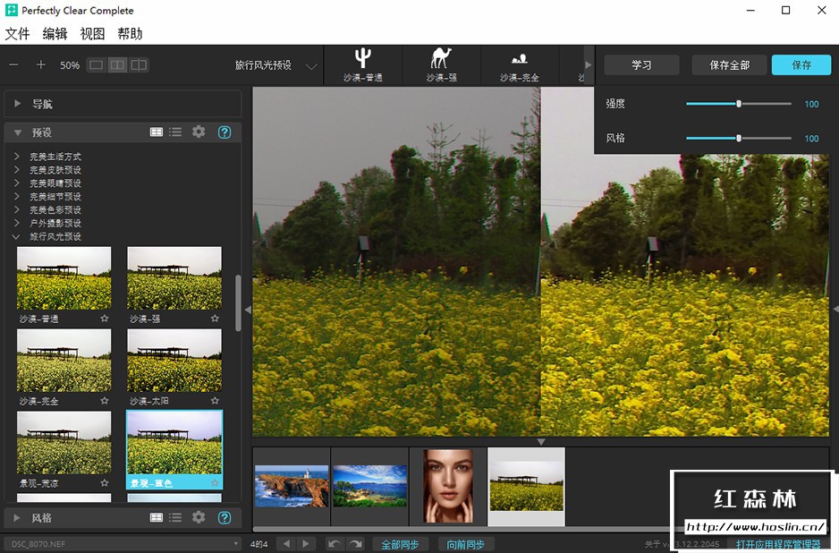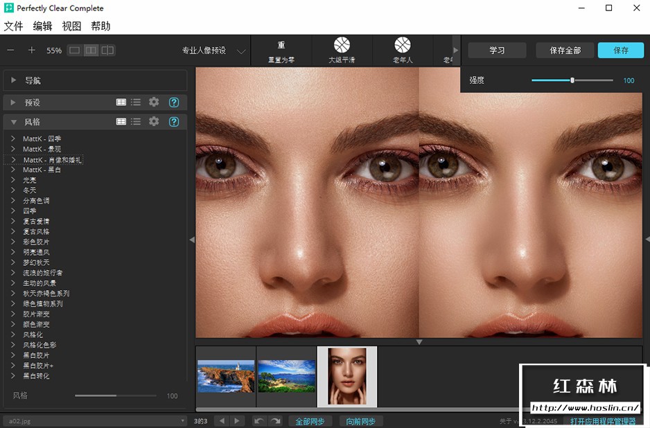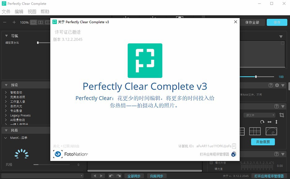 perfectly clear complete 拥有丰富的调色预设:一键降噪,灰蒙照片变清晰,一键廋脸、磨皮、添加眼神光、去黑眼圈等新功能。自动修复图片,使照片更清晰,色彩更动人。V3.12.2.2045 中文版新增了25套汉化预设,调色修图更方便智能!